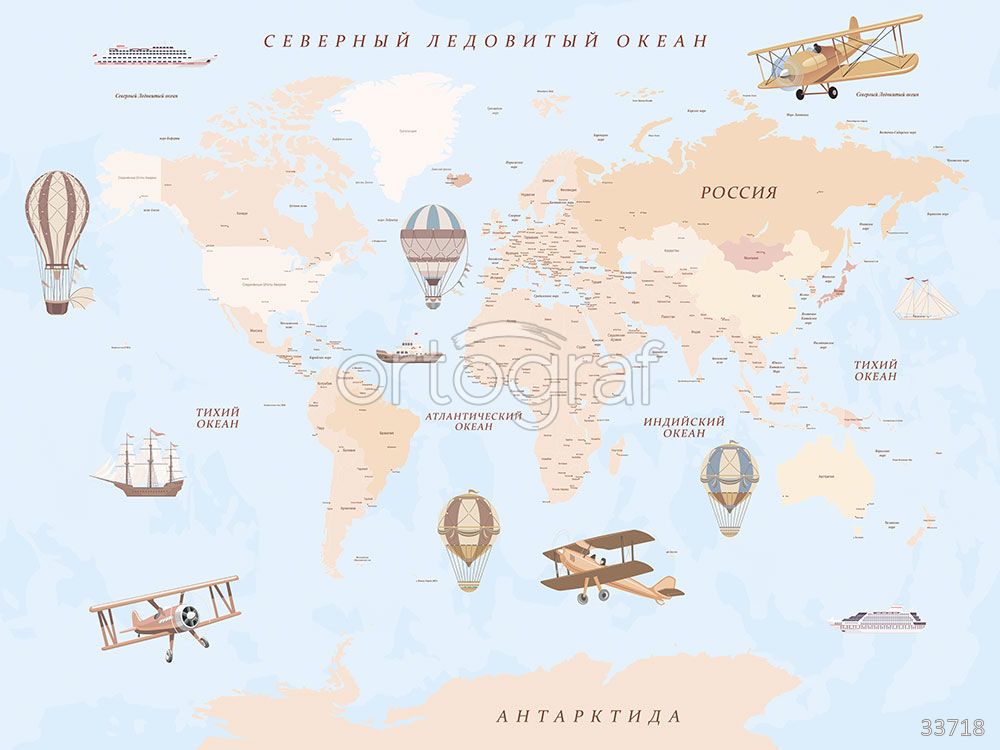 Карта мира с ретро-самолетами, кораблями и воздушными шарами добавляет в интерьер нотки путешествий и открытий. Такой сюжет способствует развитию интереса к географии и приключениям, идеально подойдет для детской комнаты, офиса или учебного пространства. Рисунок выполнен стильно и будет уместен как в современных, так и в классических интерьерах.