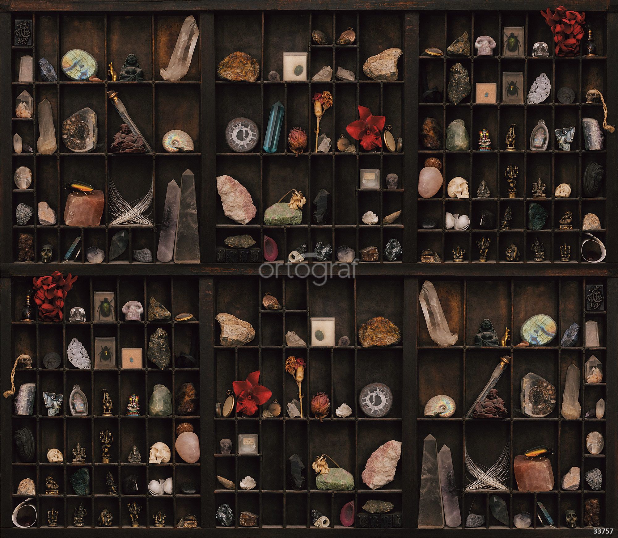 На изображении показана антикварная коллекционная витрина, заполненная минералами, раковинами, статуэтками, кристаллами, черепами и необычными предметами. Такая композиция создает ощущение уюта и загадочности, идеально подходит для создания атмосферы кабинета учёного или творческой личности. Лучше всего расположить этот сюжет в гостиной, офисе или прихожей и коридоре.