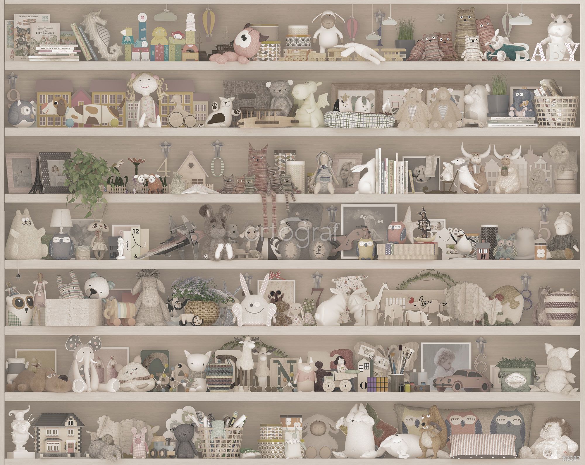 На изображении изображён детский стеллаж, заполненный разнообразными мягкими игрушками, куклами, книгами, деревянными фигурками и элементами декора. Композиция создает уютную атмосферу детской комнаты, наполненной сказочными и милыми предметами, которые приглашают к игре и фантазии.
