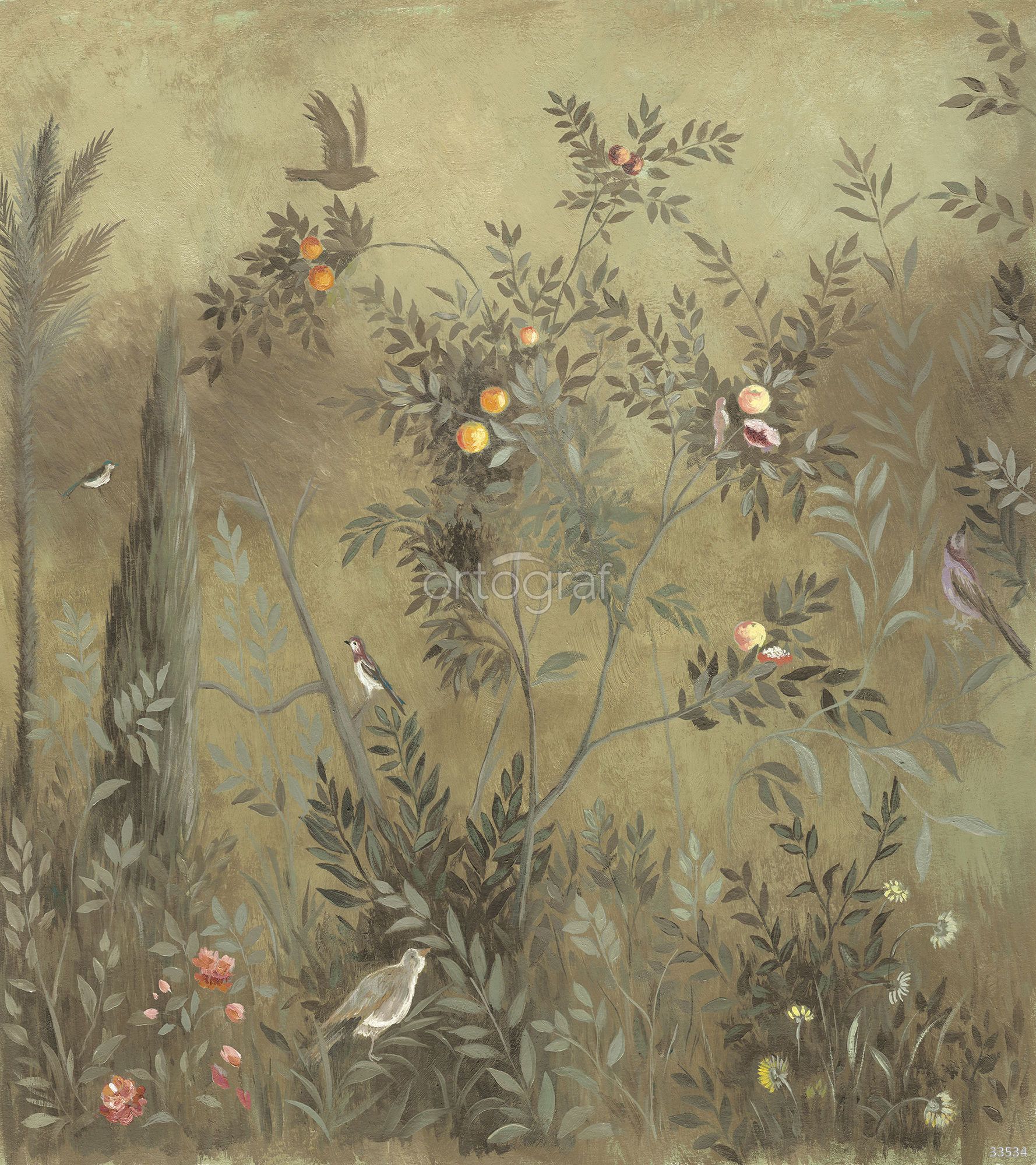 Картина в стиле старинной фрески с изображением пейзажа: на переднем плане ветвистое дерево с плодами, кустарники, полевые цветы и птицы. Такая композиция добавит в интерьер ощущение уюта, природной гармонии и изысканной классики, прекрасно подойдет для создания спокойной атмосферы. Рекомендуется для гостиных и столовых зон.