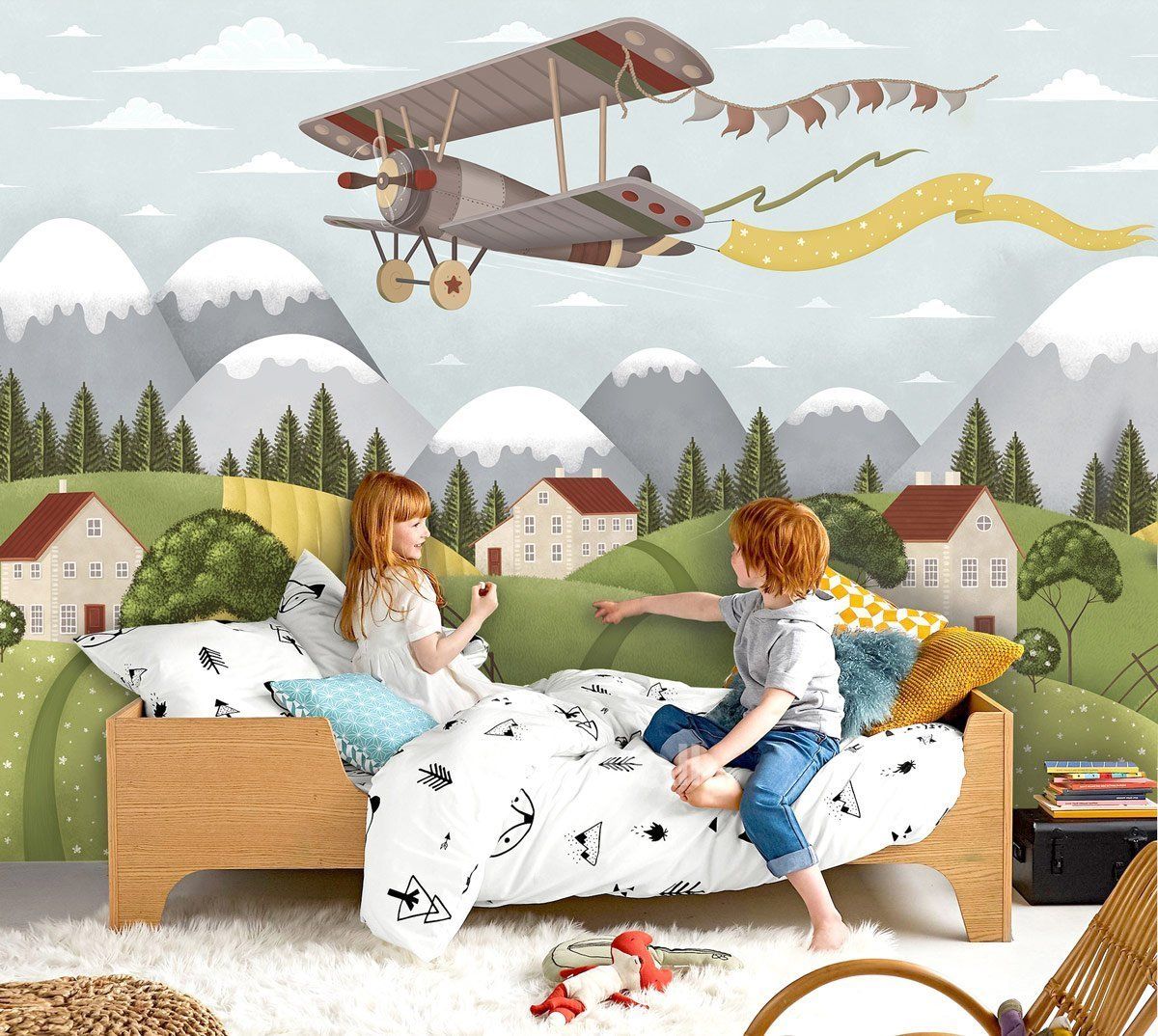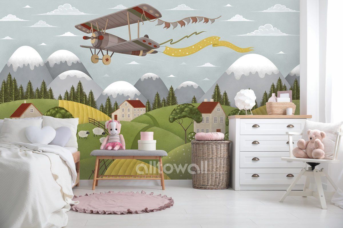 По-настоящему летний пейзаж для детской с горами Зелёные луга, пышные кроны деревьев и цветы на полянах – этот сюжет поможет создать в вашей детской атмосферу яркого и тёплого лета. Обои из серии «Полёт» отлично подойдут как в комнату мальчика, так и в детскую для девочки.