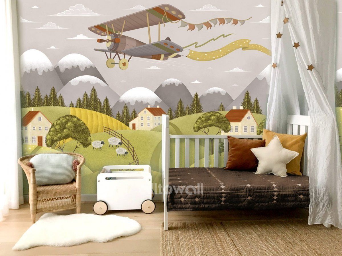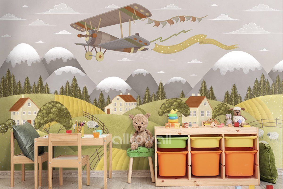 Уютный осенний сюжет для детской с горами В этом сюжете мы собрали все то, за что так любим раннюю осень! Здесь золотые листья на деревьях, светло-серое дождливое небо и приятная ностальгия по прошедшему насыщенному событиями лету.