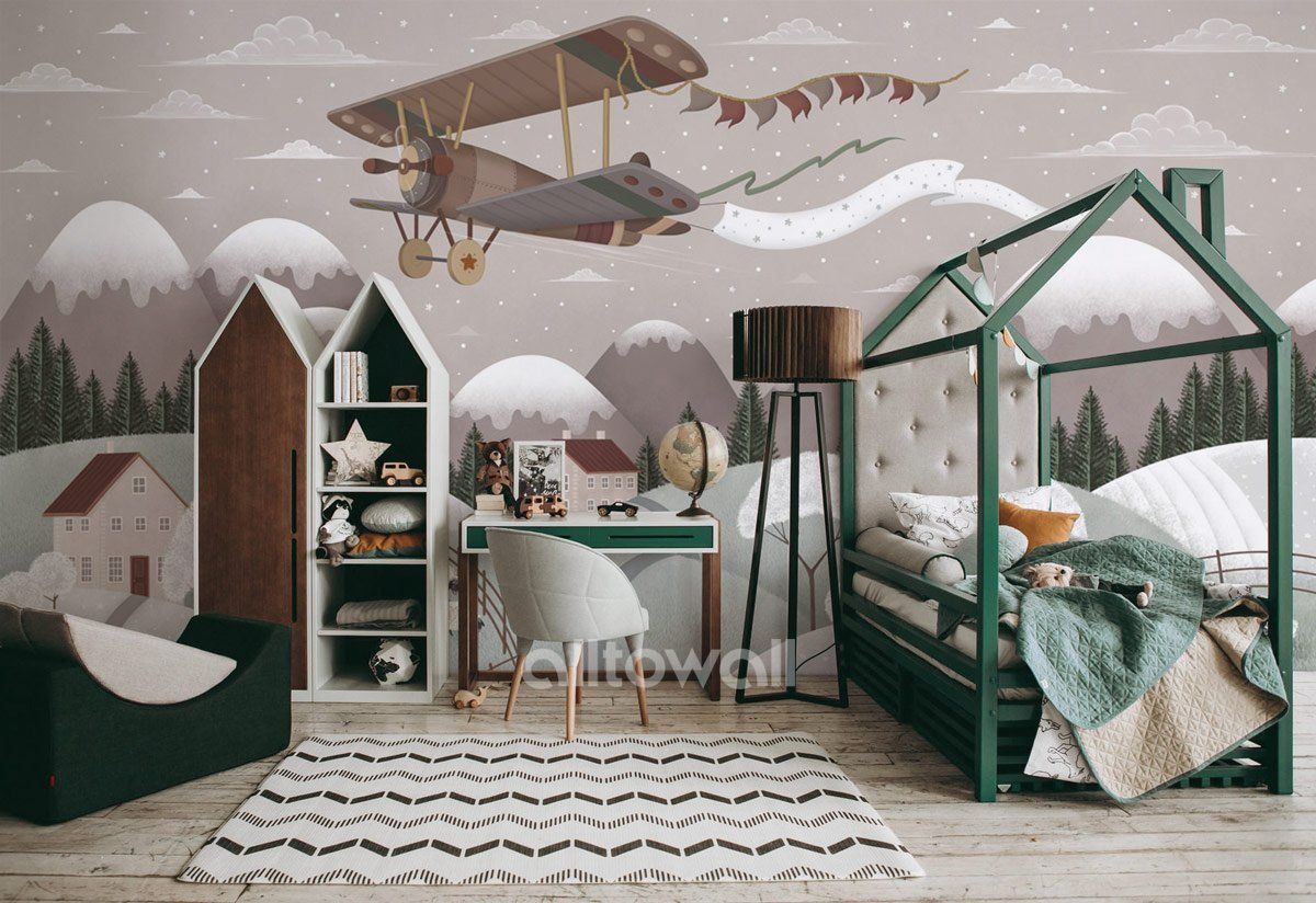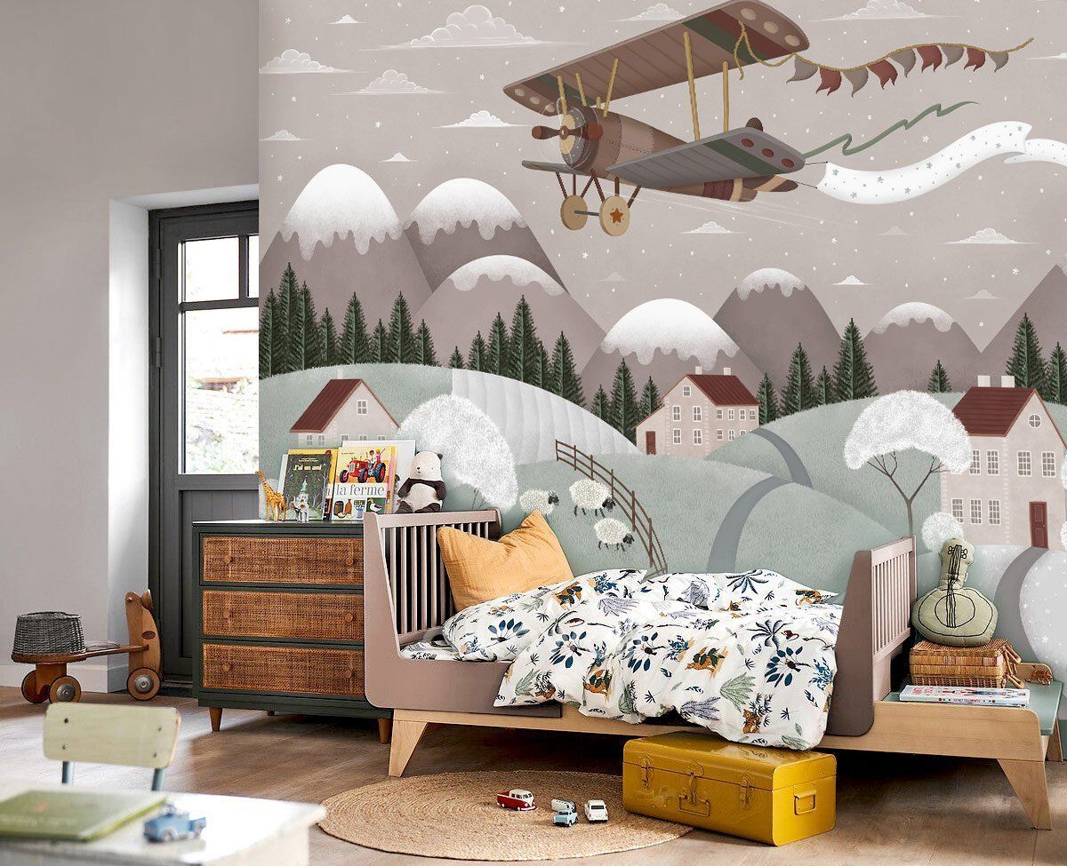 Отважный летчик летит на биплане сквозь снегопад, барашки выходят подышать свежим горным воздухом на прогулку, а первый снег уже припорошил луга и поля – это зимняя версия сюжета «Полёт» для вашей детской.