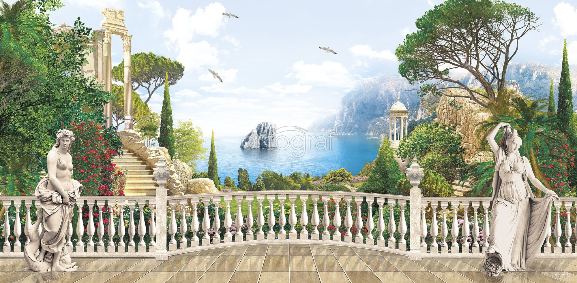 Архитектурная композиция с античными колоннами, скульптурами, террасой и видом на морской пейзаж создает впечатление сада в стиле древней Европы. Такой сюжет подойдет для интерьера, где важно добавить элегантности и классики, а также подчеркнуть благородство пространства. Хорошо смотрится в просторных и светлых комнатах.