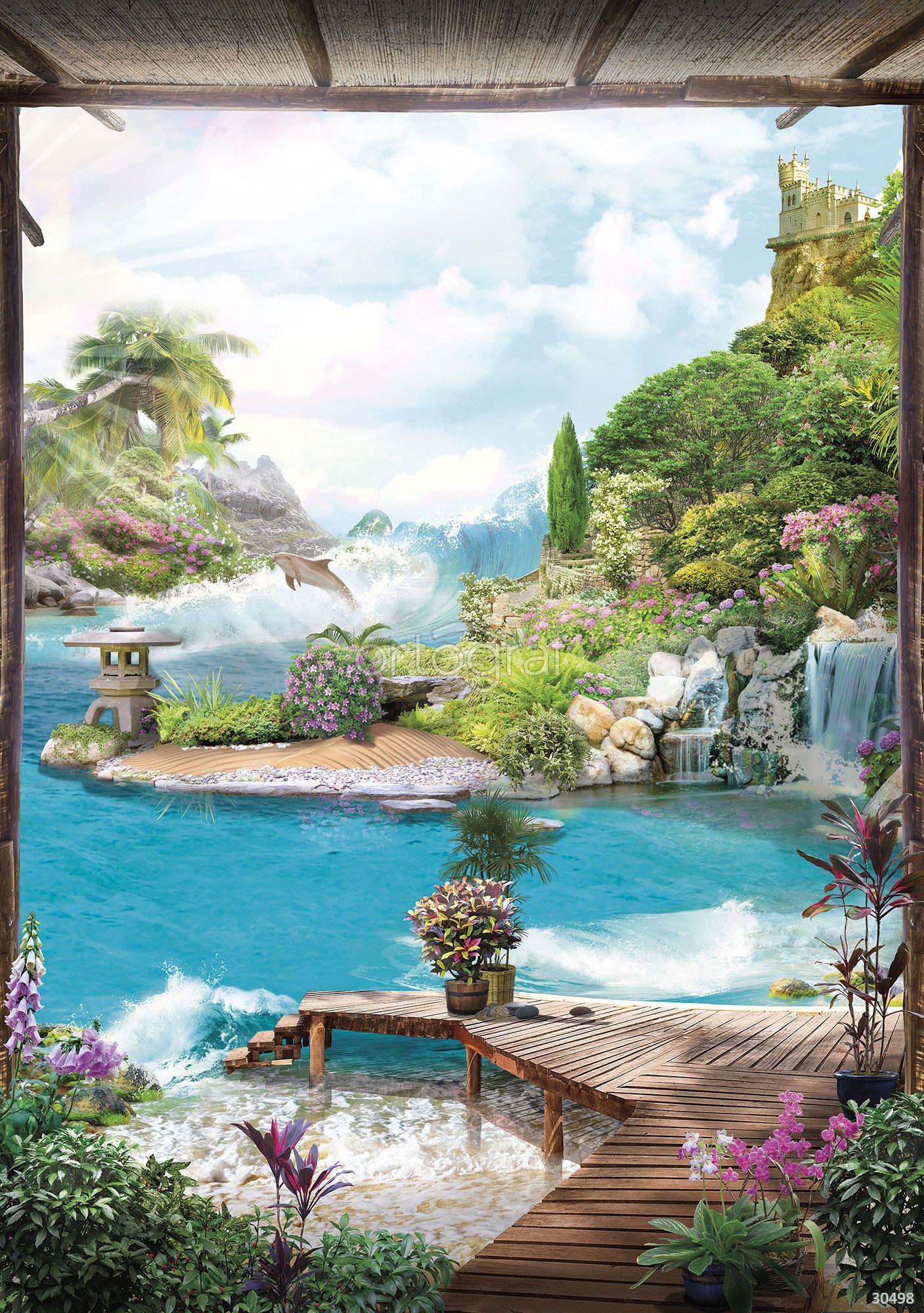 Сказочный тропический пейзаж с кристально-голубой водой, водопадами, сочной зеленью и цветущими кустарниками. На переднем плане — деревянный мостик и горшки с экзотическими растениями, вдали видно замок на скале и дельфина, выпрыгивающего из воды. Композиция создаёт ощущение уюта, отдыха и мечтательности, идеально подойдёт для детской, комнаты отдыха или гостиной, где хочется добавить атмосферу природы и сказки.