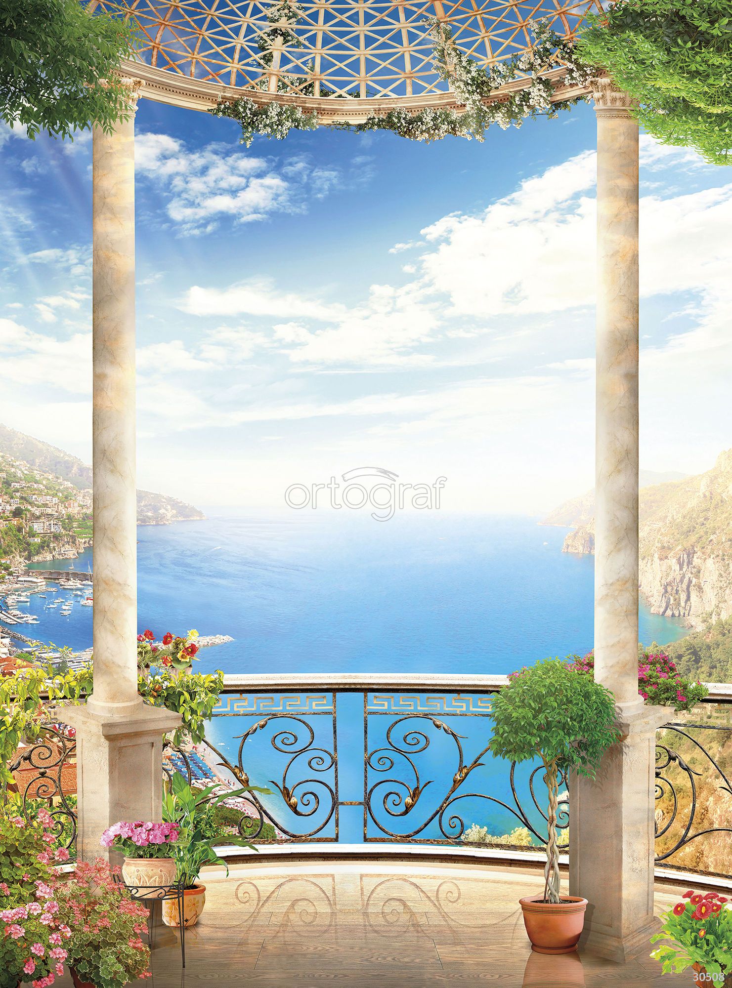Роскошная композиция с видом на морское побережье, открывающимся с классической террасы с колоннами и кованой балюстрадой. Яркое голубое небо, солнечный свет и зелёные растения создают атмосферу простора, отдыха и летнего курорта. Такое оформление идеально подойдет для гостиной, просторного холла или зоны отдыха, визуально расширяя пространство и наполняя его светом.