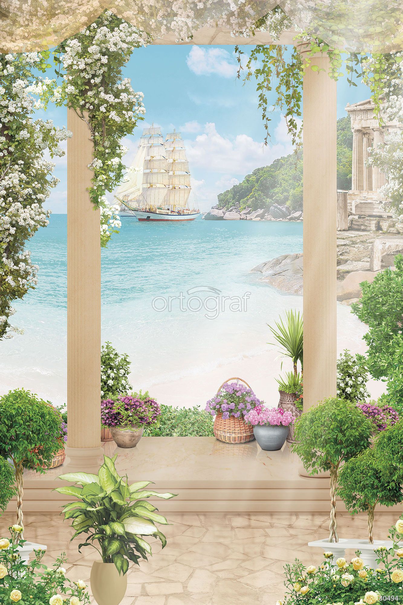 Живописная композиция с террасой, украшенной цветущими растениями и колоннами, открывающей вид на море, белый пляж, корабль и античные руины. Идиллическая атмосфера отдыха, солнца и природы делает изображение идеальным для гостиной, зоны релакса или столовой, где хочется добавить ощущение простора и свежести.