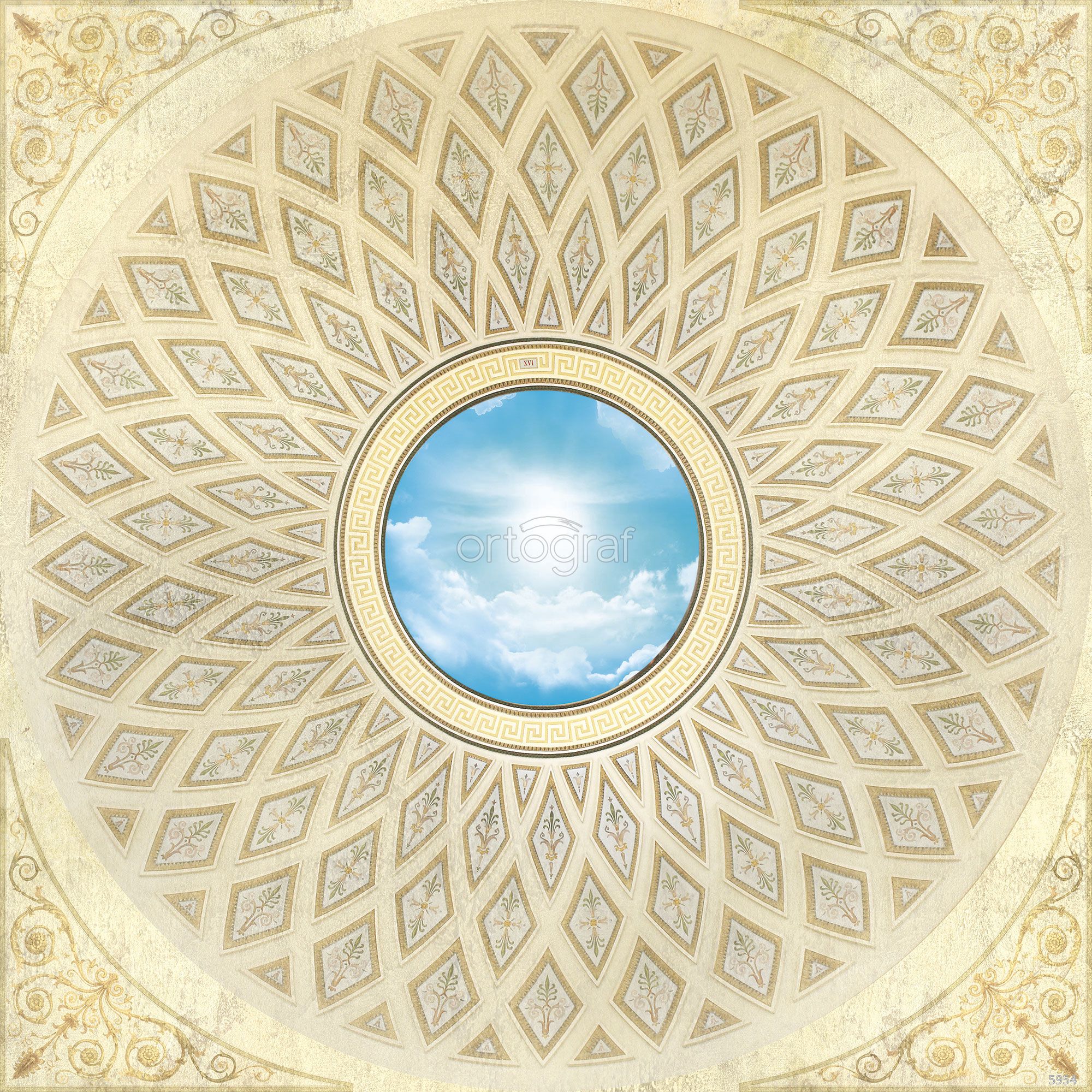 Имитированный купол с круглым «окном» в небо создаёт эффект расширения пространства и добавляет светлый, гармоничный акцент в интерьер Такой рисунок идеально подойдёт для оформления гостиной, столовой, а также прихожей и коридора, придавая помещению торжественность и изысканность
