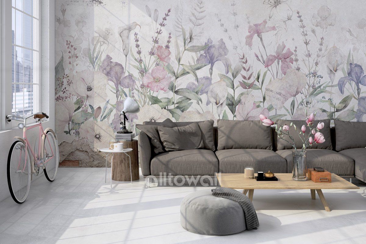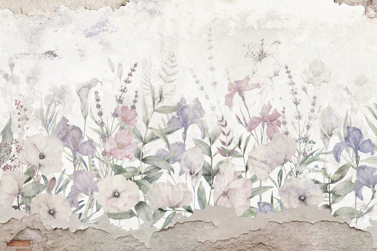 Светлый весенний сюжет с нежными акварельными цветами. «Прекрасный миг» — стильные обои с имитацией фрески и текстуры бетона.