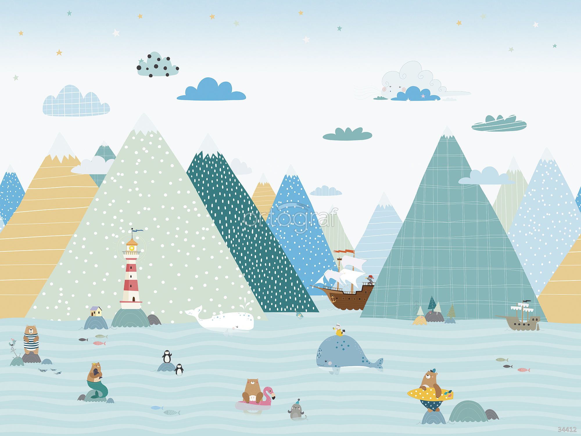Сюжет наполнен морскими приключениями: среди гор, волн и облаков изображены киты, медведи, пингвины, маяк, корабли и маленькие домики. Иллюстрация насыщена деталями, создает атмосферу сказочного путешествия, отлично подходит для оформления пространства, где важна игровая и мечтательная среда. Такой рисунок гармонично впишется в интерьер с упором на фантазию и позитив.