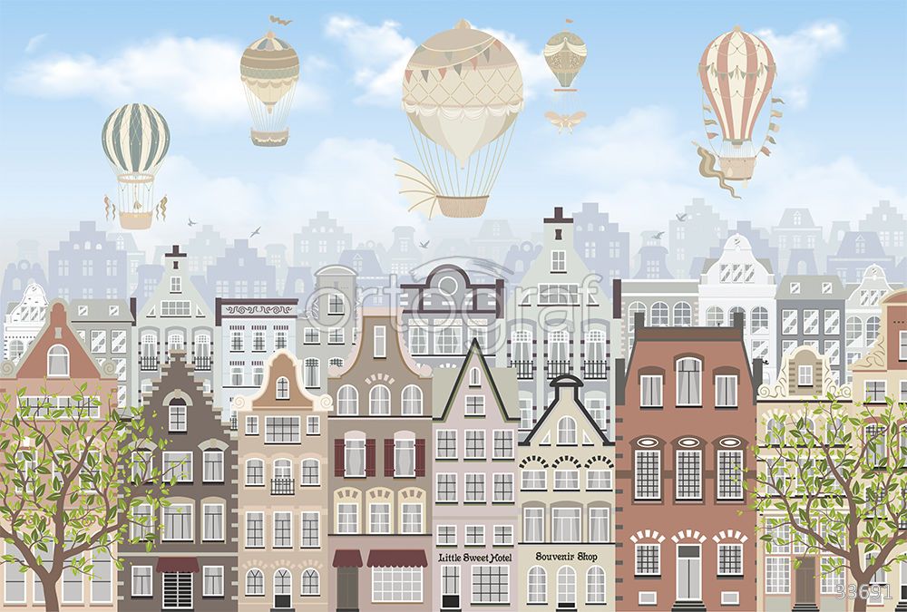 Городская панорама с уютными домиками, воздушными шарами и деревьями создает атмосферу европейского городка и уюта. Такой сюжет наполняет пространство легкостью и плавными линиями, подчеркивает стиль и отлично подойдет для детских, прихожей и коридора, а также для кухни. Рисунок идеально подойдет для современных и светлых интерьеров.