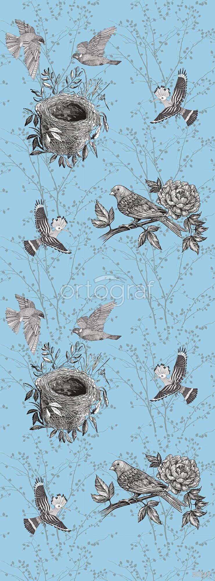 На изображении представлены птицы, гнёзда и цветы, стилизованные под графическую иллюстрацию. Птицы изображены как в полёте, так и сидящими на ветках рядом с цветами и гнёздами, что создаёт атмосферу уюта и природы с элементами ручной гравюры.