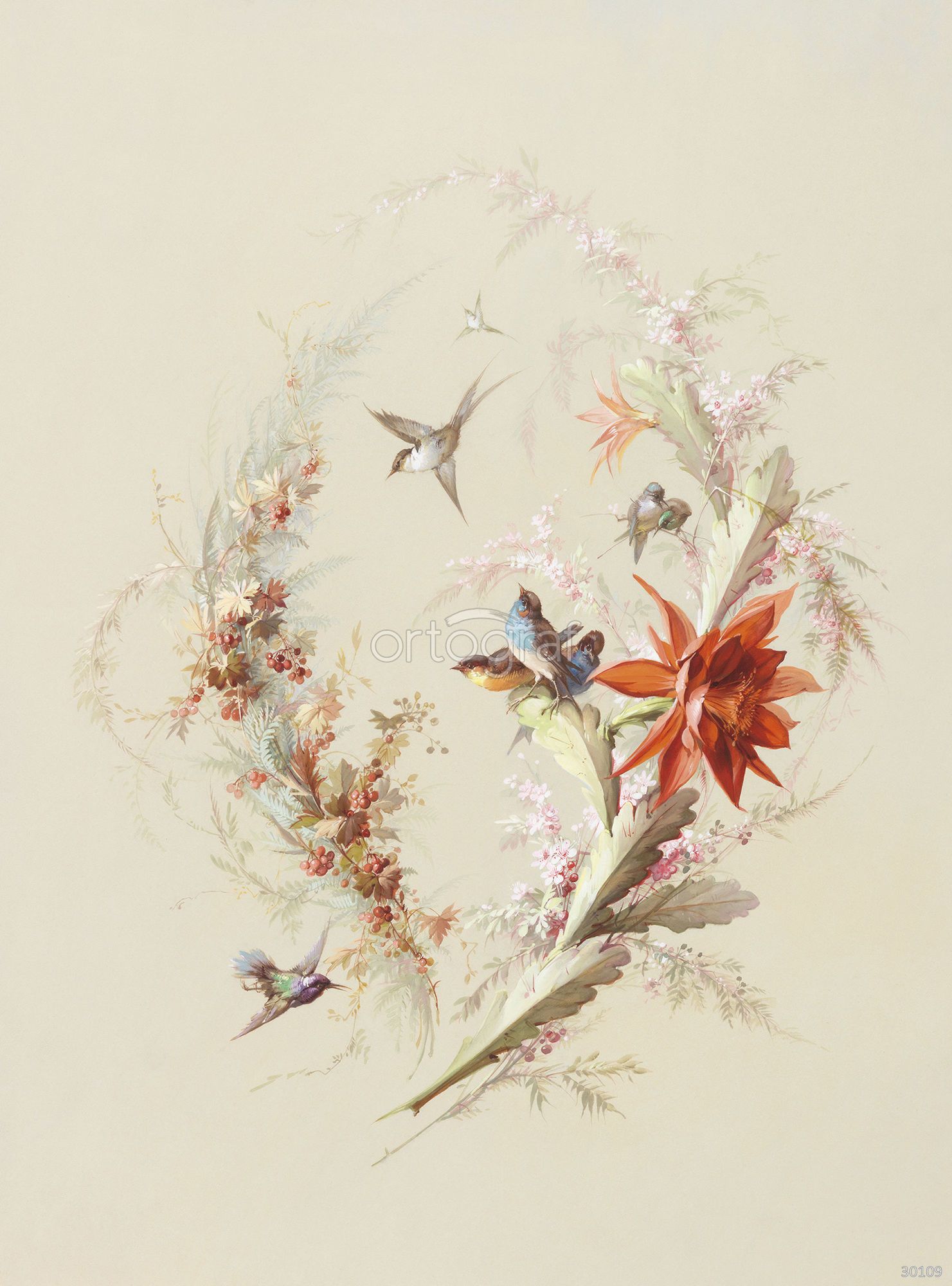 На картине изображена изысканная композиция из птиц и цветов: несколько маленьких птиц отдыхают на изогнутых ветвях среди пышной растительности и крупных распустившихся бутонов. Легкая, воздушная атмосфера сцены передает ощущение весенней гармонии и восхищения природой, где птицы и цветы органично вплетены в декоративный венок.
