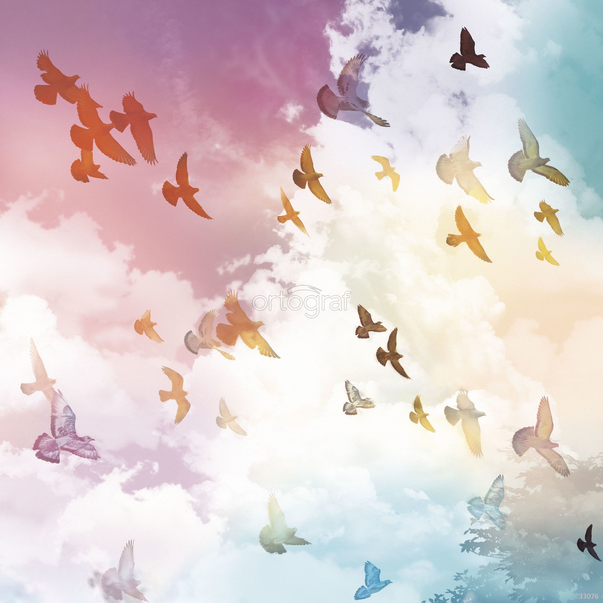 Стадо птиц, летящих на фоне облачного неба с легким градиентом, создает ощущение легкости, свободы и движения. Такой сюжет принесет свежесть и воздушность в интерьер, добавив ему динамику и позитивное настроение. Хорошо подойдет для современных светлых пространств.