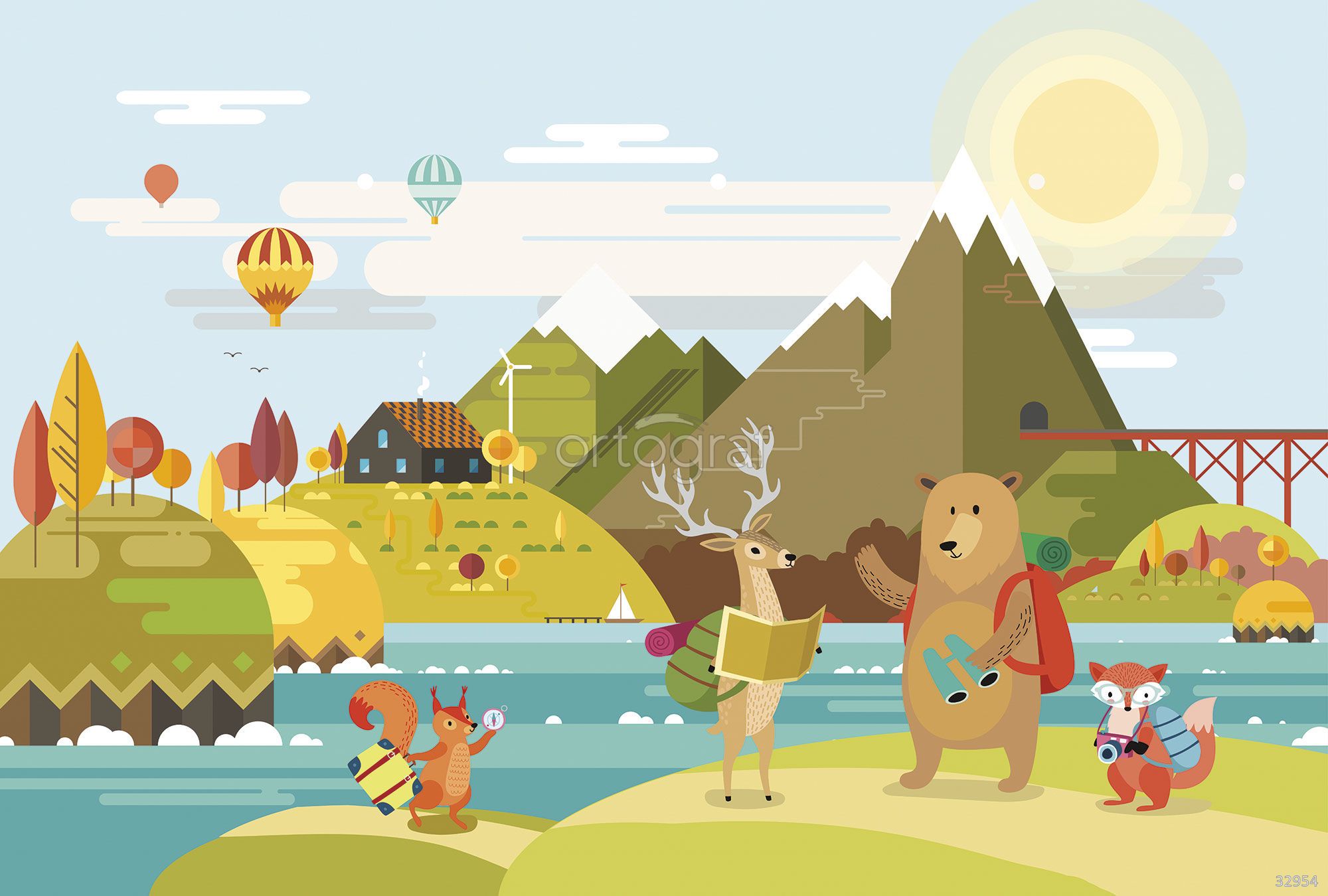 На изображении изображены медведь, олень, белка и лиса, которые отправились в поход, держат рюкзаки, карту, бинокль и компас. На фоне видны река, домик, горы, воздушные шары и мост, что создаёт атмосферу приключения и путешествий. Иллюстрация отлично подойдёт для оформления детской комнаты или игровой зоны.