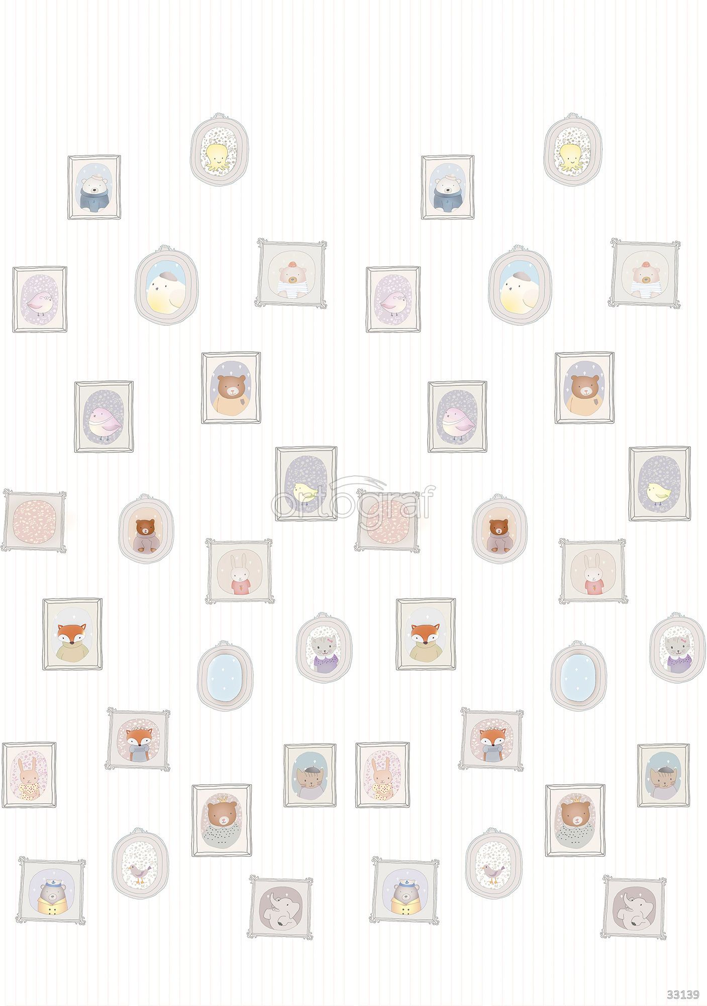 Рисунок состоит из множества рамок, в которых изображены милые животные и сказочные персонажи. Композиция создает ощущение уюта, беззаботности и подходит для создания спокойной и радостной атмосферы. Такое оформление идеально подчеркнет индивидуальность пространства для малышей и поможет сделать интерьер добрее и веселее.