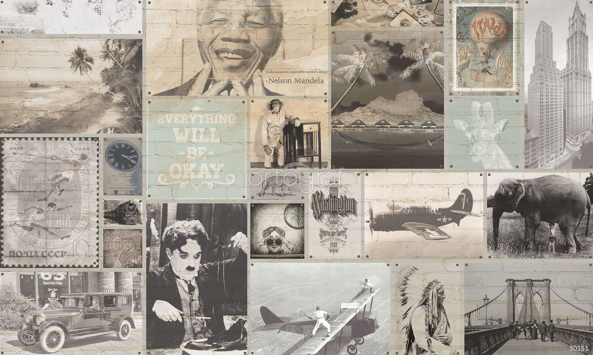 На изображении представлен выразительный тематический коллаж из винтажных фотографий, постеров и открыток, отображающих сцены из истории XX века и моменты повседневной жизни. В композиции встречаются кадры автомобилей, архитектурные сооружения, памятные надписи, животные, сцены с человеческими фигурами, самолёт, слон, жираф, и фразы наподобие "Everything will be okay". Атмосфера передачи ностальгии и воспоминаний о прошлых эпохах — ощущение того, что на стене собрана коллекция культурных символов, знаковых событий и бытовых сюжетов.