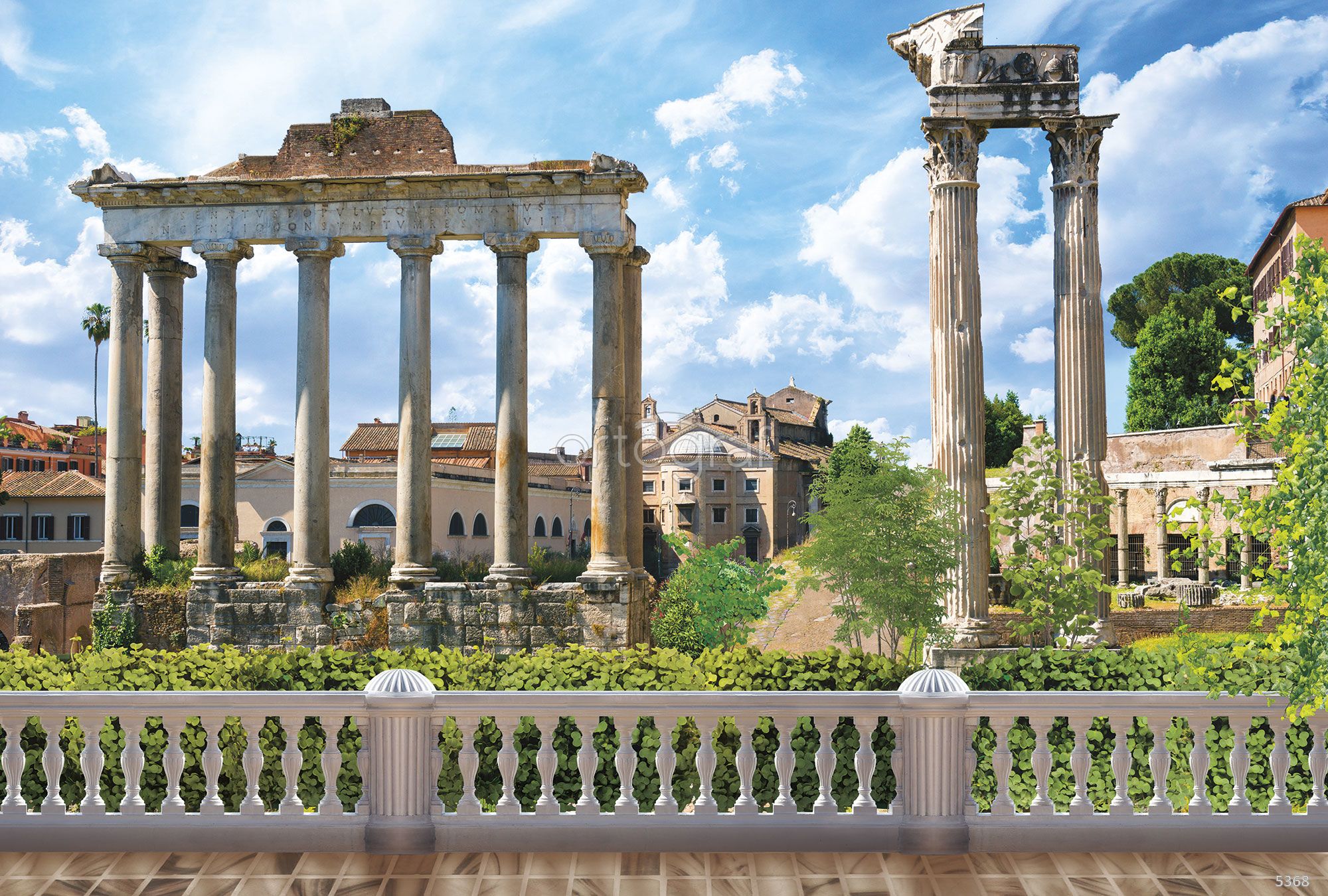 Изображение открывает вид с балкона на руины античного форума с величественными колоннами, на фоне исторических зданий города. Здесь можно узнать Форум в Риме — один из символов древней архитектуры. Такое панорамное изображение придаёт интерьеру ощущение открытого пространства и культурной глубины, особенно уместно будет в оформлении офиса, гостиной или прихожей и коридора.