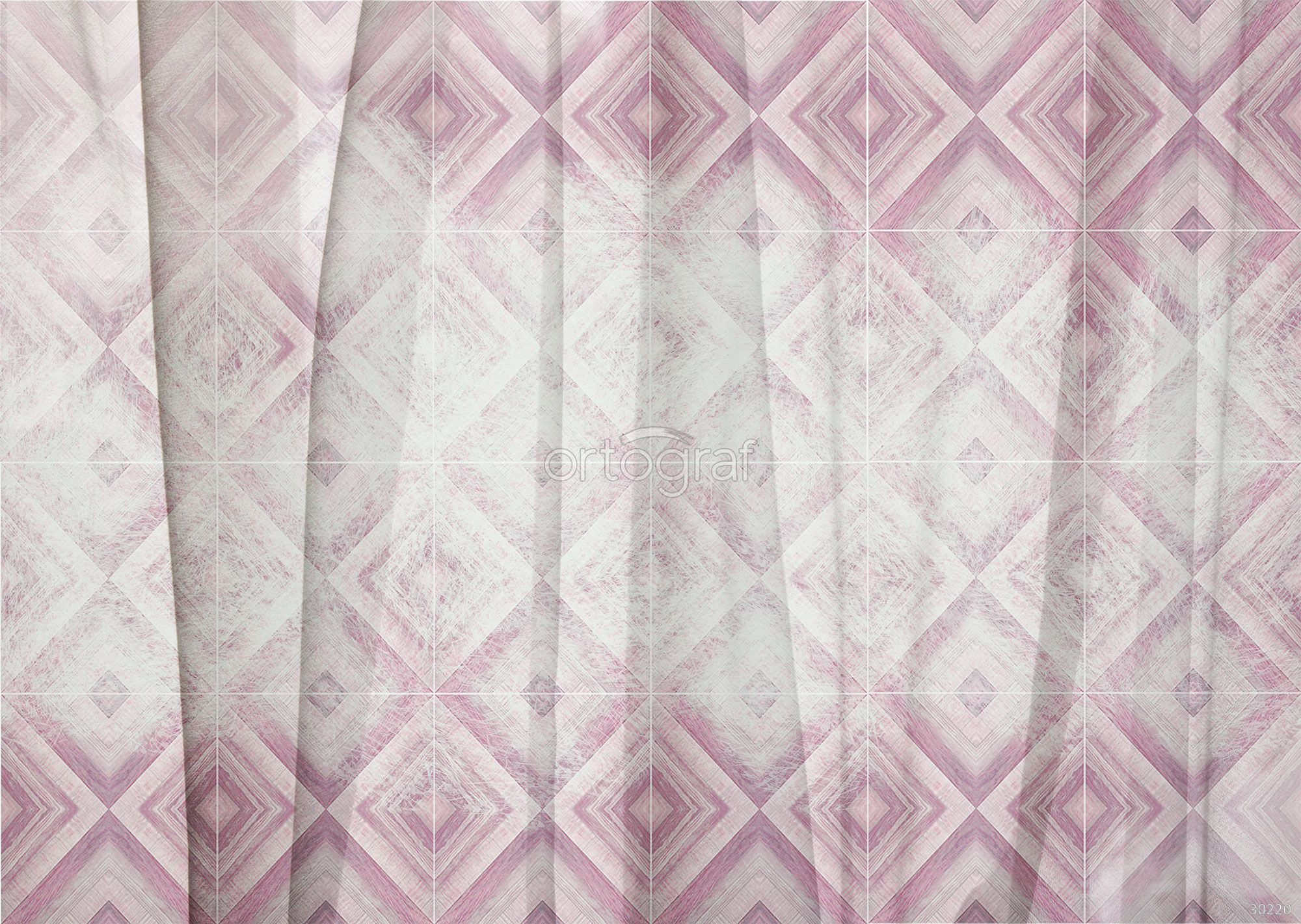 На изображении представлен декоративный узор, выполненный в мягких розовых и белых оттенках, с повторяющимся ромбовидным мотивом. Фон выглядит текстурированным, местами напоминая слегка затёртую или состаренную ткань, а центральные ромбы выделены более насыщенными границами и тончайшими линиями. Лёгкие складки придают орнаменту динамику и ощущение объёма, словно это занавеска или декоративное полотно.