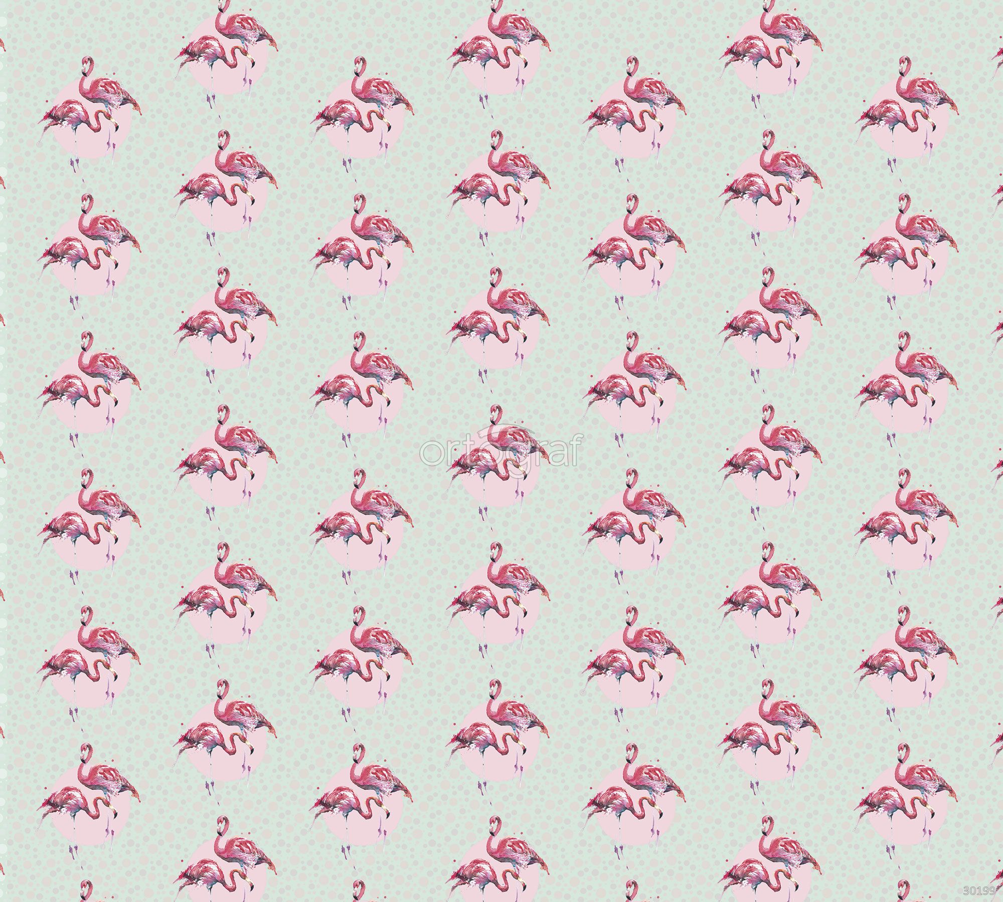На изображении представлен декоративный паттерн с группами розовых фламинго, стоящих на одной ноге. Птицы изображены в паре на фоне круглого розоватого пятна, а весь узор ритмично повторяется на светло-мятном фоне с мелкими точками, создавая атмосферу тропической нежности и лёгкости. Композиция выполнена в акварельной стилистике, добавляющей мягкости и иллюзорности изображению.