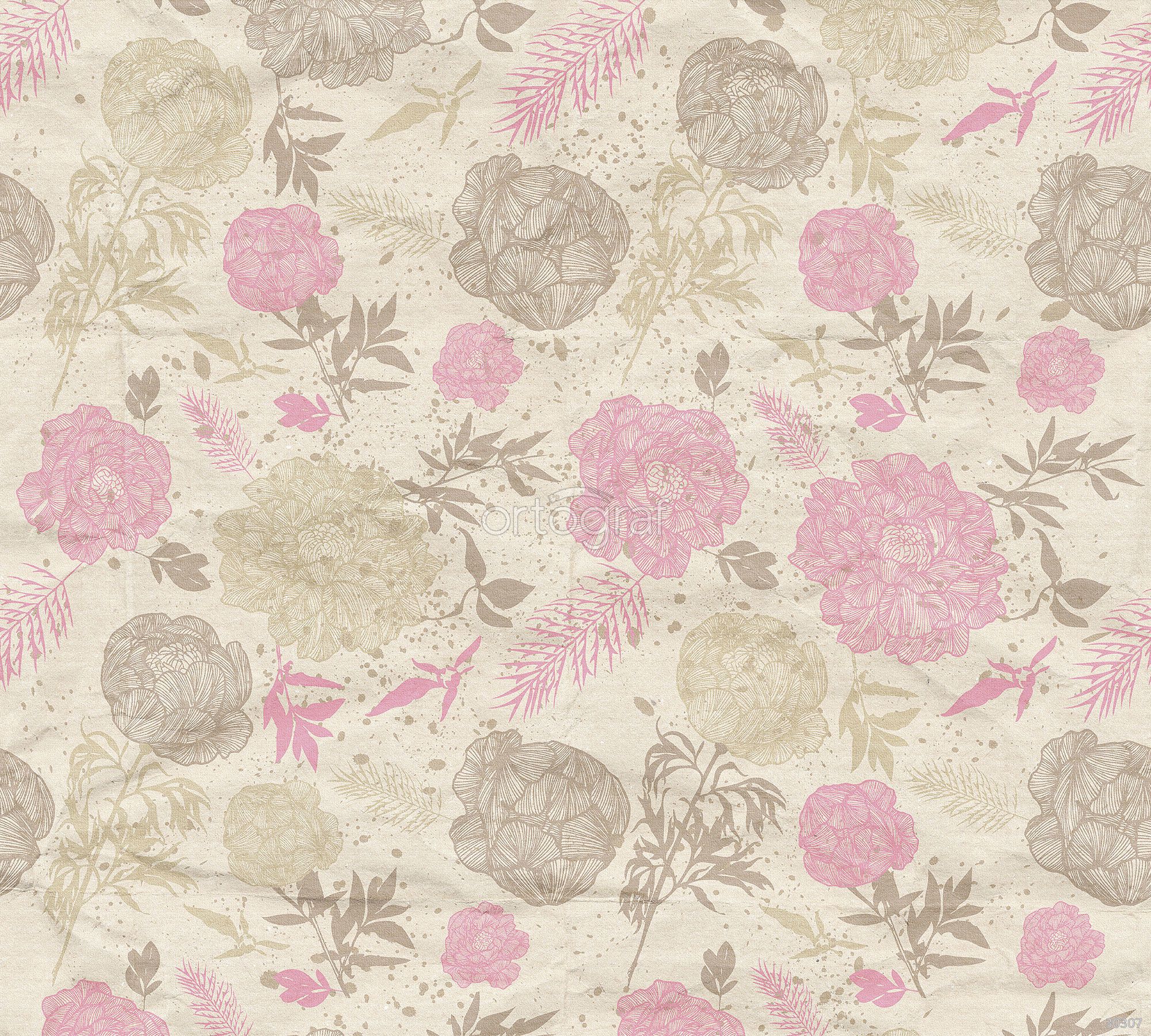 На изображении представлена декоративная композиция с множеством детализированных крупных и мелких цветов, листьев и веток, вычерченных тонкими линиями и равномерно распределённых по фоновой текстуре. Растительные элементы создают ощущение лёгкости и естественной гармонии, напоминая стилизованный гербарий или газетный ботанический принт.