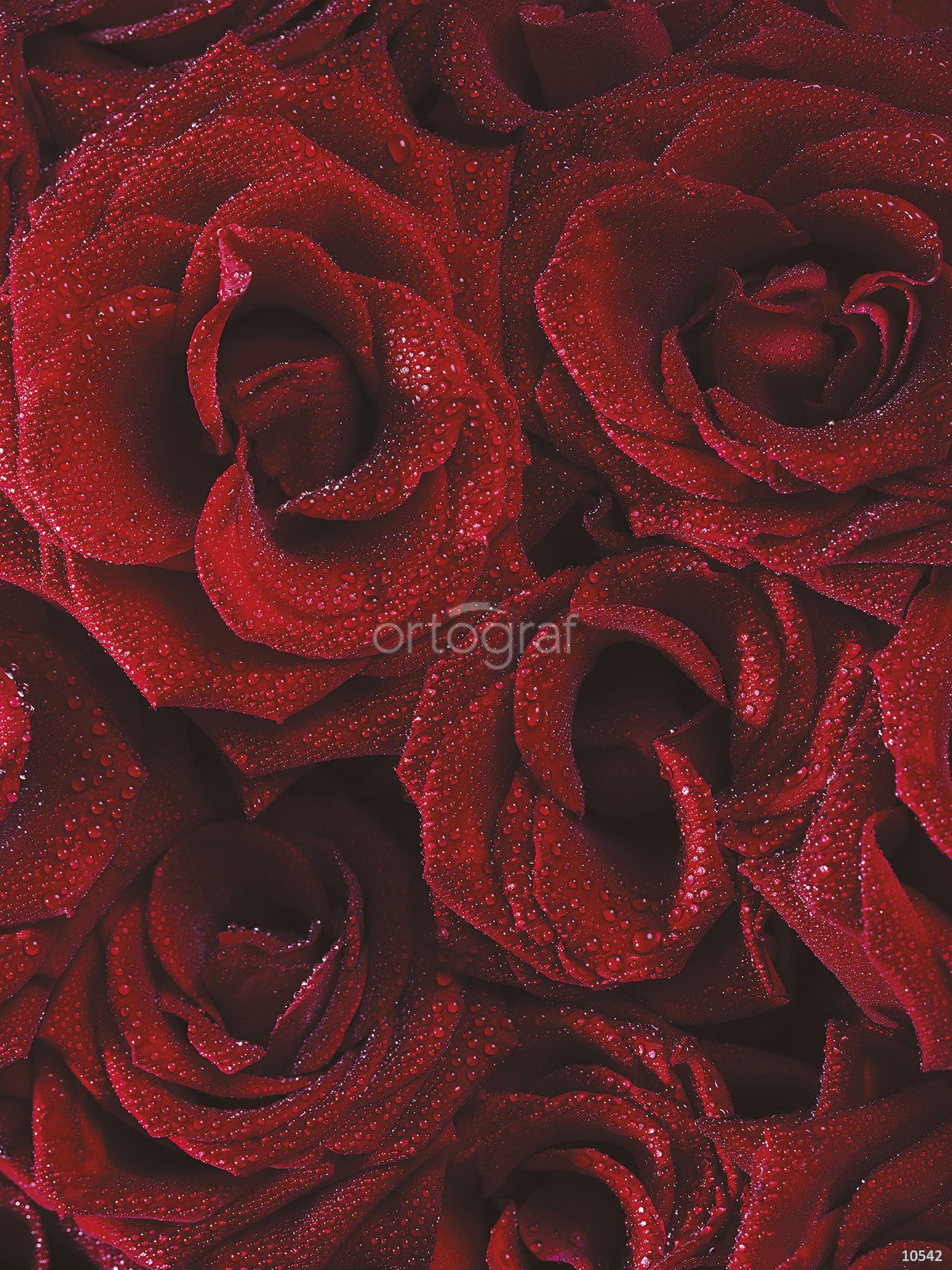 Крупным планом изображён плотный букет раскрытых роз с каплями воды на лепестках. Композиция передаёт ощущение свежести, романтической утончённости и совершенства природных форм, ассоциируясь с символикой любви и красоты
