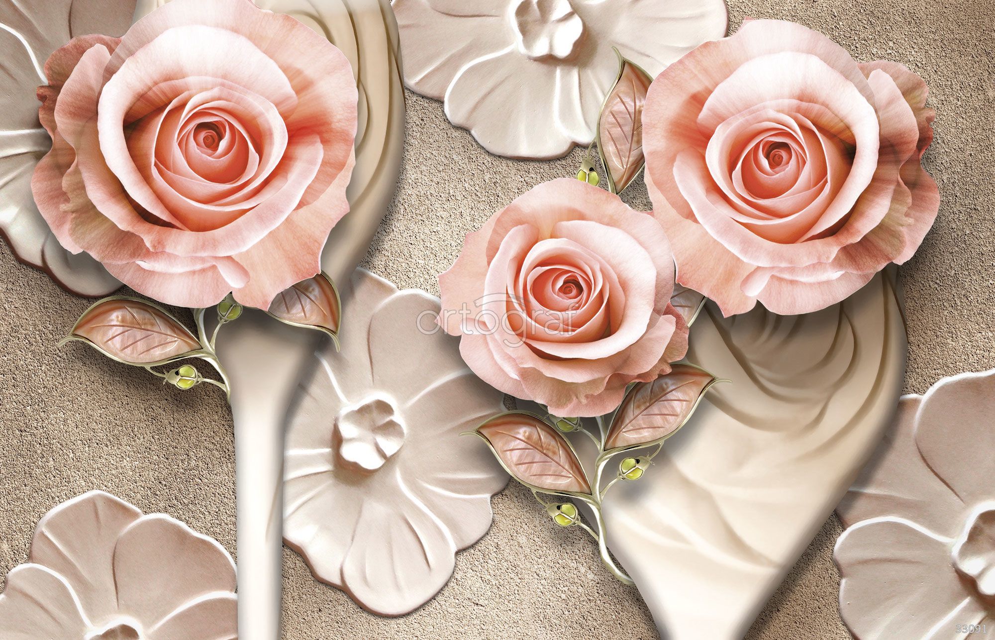 Композиция из объемных нежных роз с лепестками и декоративными элементами на текстурном фоне создает ощущение уюта, романтики и изысканной атмосферы. Такой сюжет идеально подходит для оформления элегантных, стильных и уютных пространств, подчеркивает женственность и гармонию интерьера.