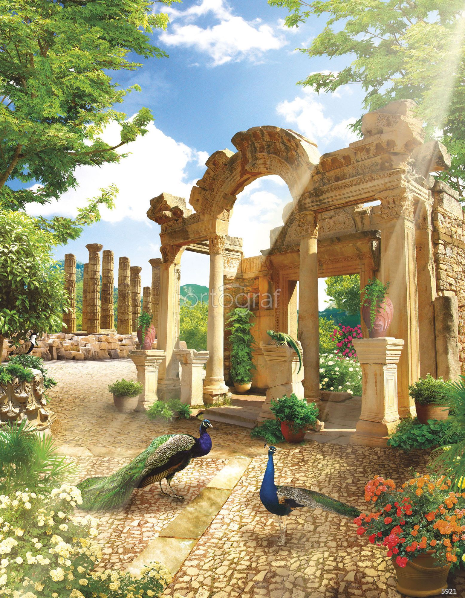 Изображение древних руин с павлинами среди зелени и цветов создает атмосферу сада, наполненного историей и романтикой Такой сюжет добавит интерьеру ощущение простора, уюта и путешествия во времени Хорошо подойдет для гостиной, столовой, а также будет уместен в прихожей и коридоре
