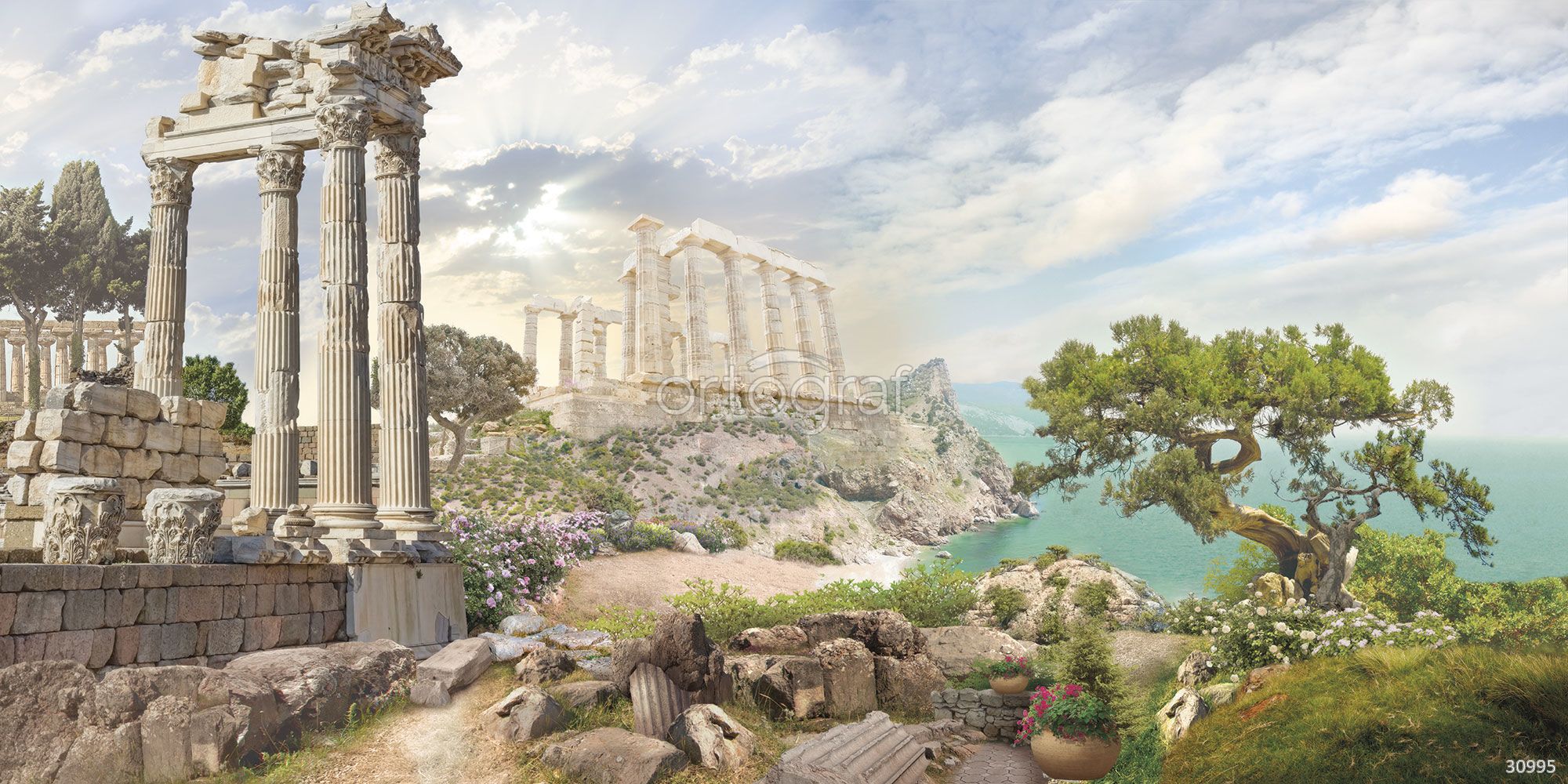 Античные руины с величественными колоннами на фоне побережья, цветущих кустов и живописного пейзажа. Композиция передаёт атмосферу истории, красоты и гармонии природы с архитектурой, визуально расширяет пространство и добавляет элегантности интерьеру. Такой сюжет идеально подходит для оформления просторных, светлых помещений.