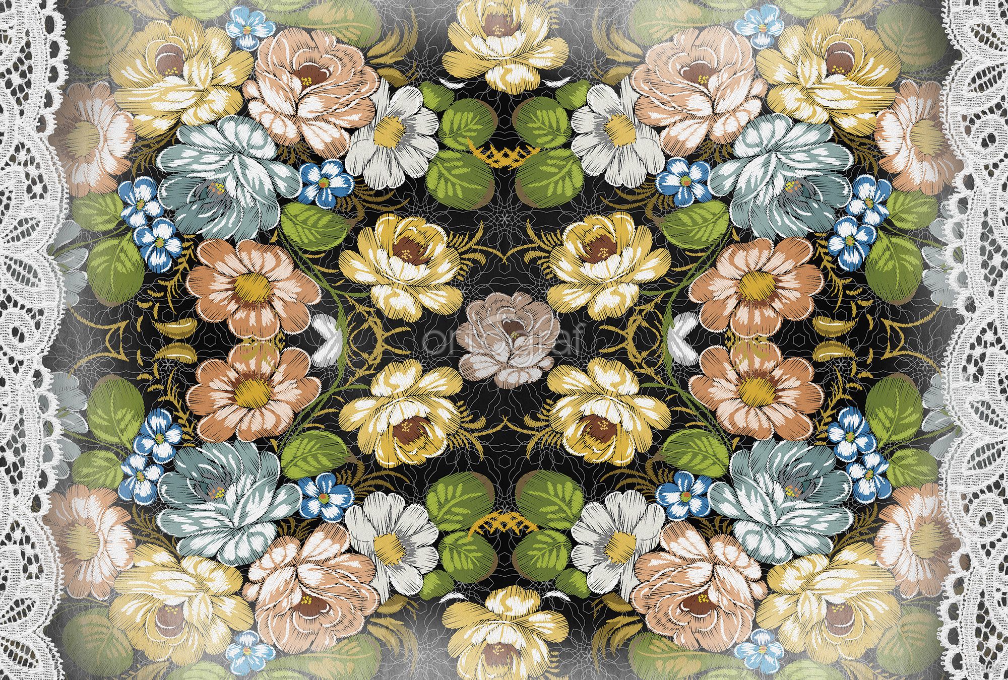 На изображении пышный цветочный узор с орнаментом, выполненный в традиционном стиле, по краям композиции — изящное кружево. Такой сюжет наполняет интерьер уютом, праздничностью и ноткой народного декоративного искусства.