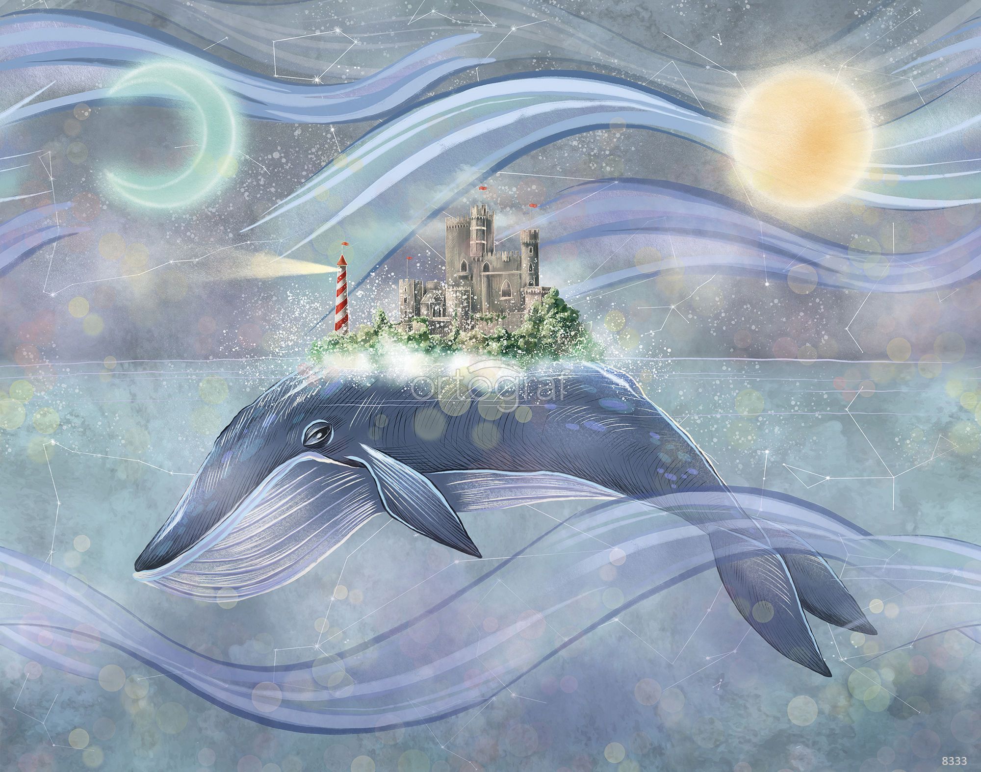 Иллюстрация с большим китом, несущим на спине остров с замком и маяком, среди звёздного неба и фантастических волн, создаёт ощущение сказки и волшебства. Такой рисунок пробуждает воображение и идеально подчеркнет атмосферу уюта и мечтательности в помещении для отдыха или детской. Особенно хорош для комнат, где хочется добавить элемент фантазии и загадки.