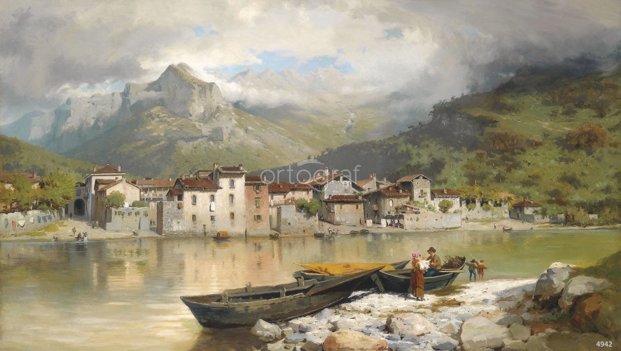 На полотне изображён живописный уголок старинной деревни с домами у подножия гор, отражающимися в спокойной водной глади. На переднем плане — лодки, группа людей и каменистый берег, создающие атмосферу умиротворённости и покоя. Такой сюжет наиболее гармонично впишется в интерьер гостиной, столовой или офиса, придавая помещению ощущение простора и спокойствия.