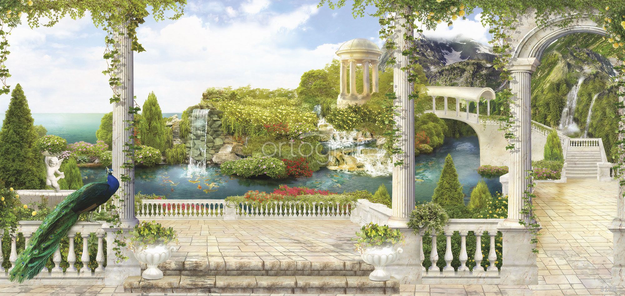 Роскошный сюжет с видом на пышный сад, водопады и архитектурные элементы создаёт ощущение простора, свежести и сказочной атмосферы. Панорамная композиция визуально увеличивает помещение и наполняет его светом и жизнью, делая интерьер по-настоящему уникальным. Такой дизайн идеально подойдёт для просторных зон, где хочется добавить яркий акцент и элемент мечты.
