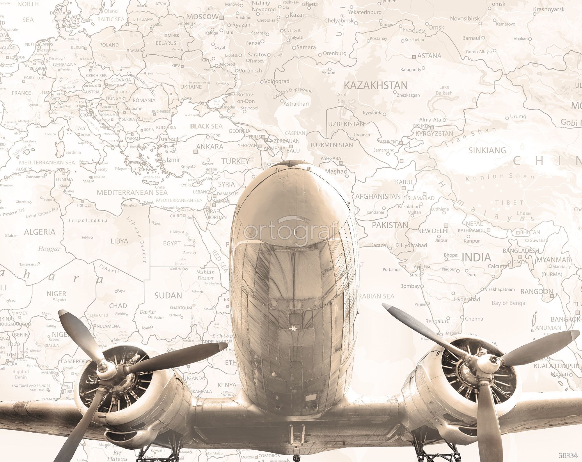 На изображении представлен винтажный транспортный самолёт с тремя пропеллерами, изображённый на фоне карты мира, охватывающей регионы Европы, Ближнего Востока и Азии. Центральная перспектива акцентирует динамику полёта и ассоциацию с дальними путешествиями и историей авиации. Карта выполнена в светло-бежевой гамме, что придаёт сцене ретро-атмосферу.