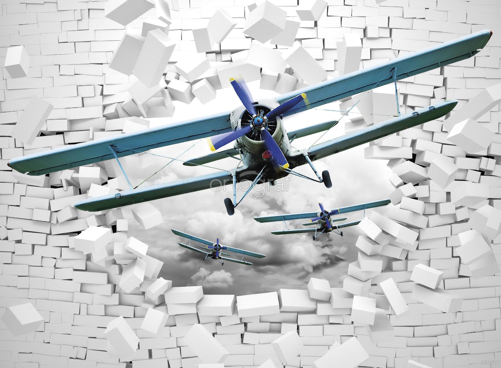 На изображении эффектно показаны три самолёта, пролетающие сквозь "пролом" в стене из кубических блоков, создавая динамичную иллюзию движения. Такой сюжет особенно понравится любителям авиации и активных впечатлений, добавит энергии и неординарности интерьеру. Подходит для современных пространств и тех, где ценятся яркие, бодрящие визуальные акценты.