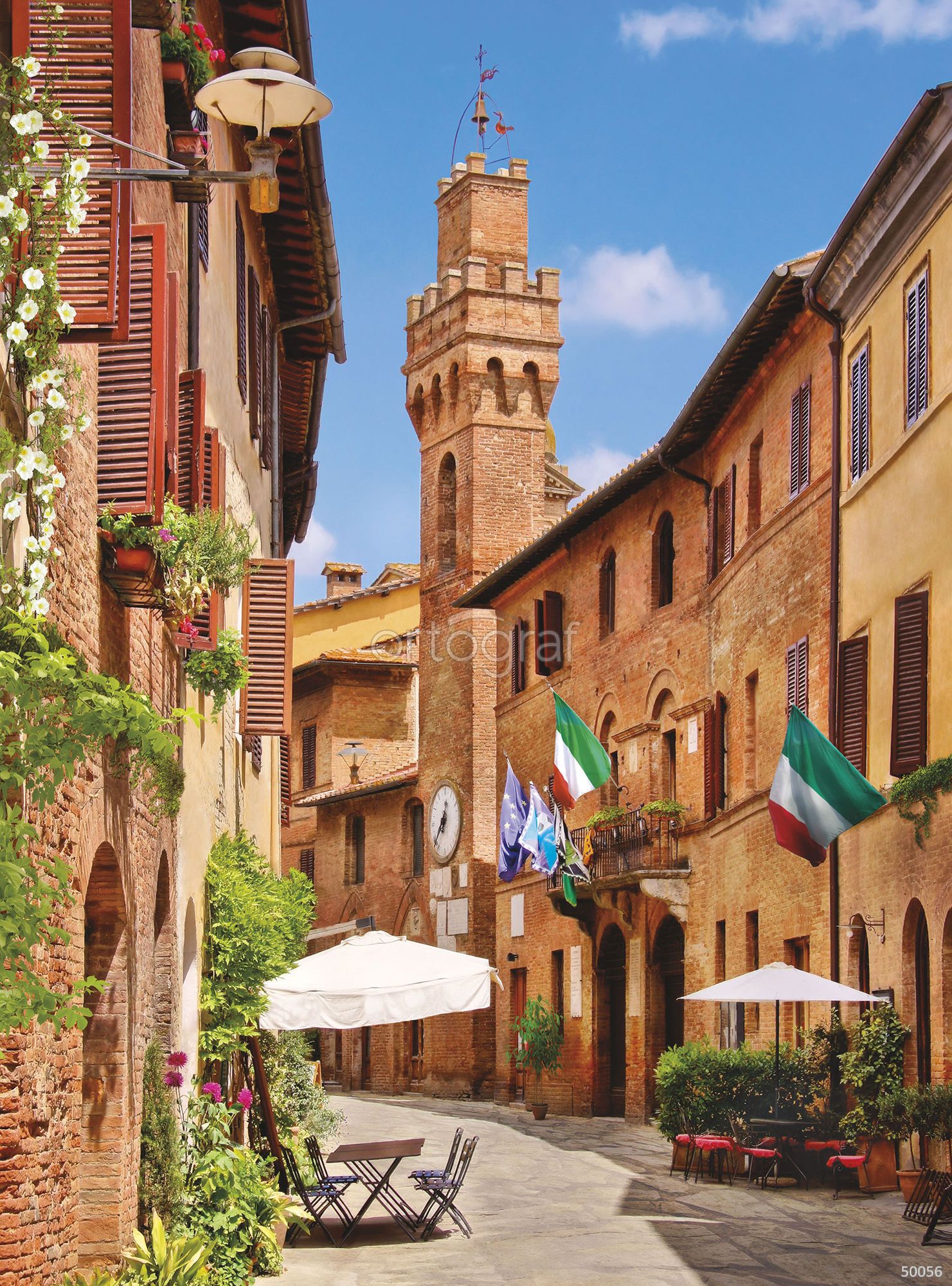 Сюжет передаёт уютную атмосферу итальянского городка с узкой улочкой, историческими строениями из кирпича, башней, уютными кафе со столиками под зонтиками и развевающимися флагами. Это изображение отлично подходит для оформления кухни, столовой, прихожей и коридора или гостиной, внося нотки южного уюта и европейского шарма.