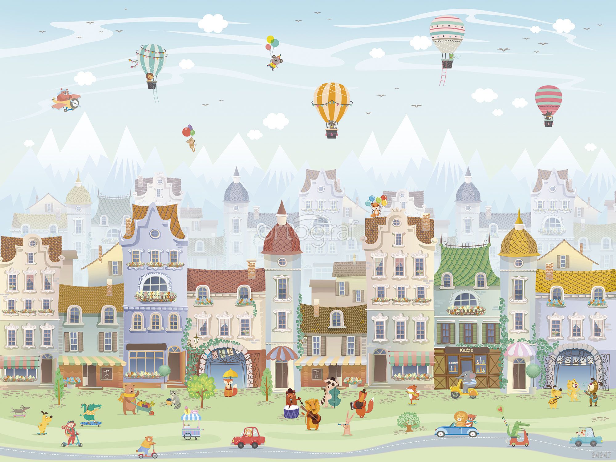 На рисунке изображен сказочный городской пейзаж с забавными зверятами, играющими и катающимися на транспорте, воздушными шарами и архитектурой изломанных домиков. Иллюстрация создает атмосферу путешествия, жизни и радости, привносит динамику и позитивное настроение. Такой сюжет отлично подойдет для оформления пространства, где желательны мечтательность и вдохновение. Особенно удачно этот сюжет будет смотреться в помещениях, где важна поддержка творческого и игрового начала.