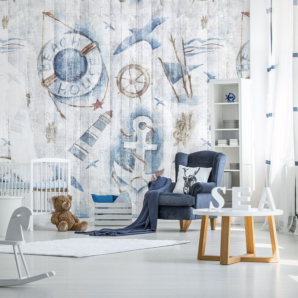 SEASHORE HOUSE – коллекция 2022 года, посвященная морской тематике. Спокойная, умиротворяющая атмосфера и ненавязчивый сюжет отлично подходят для комнаты ребенка или подростка. Основной сюжет – изображение предметов морской атрибутики на белом или темно-синем фоне. Особенности рисунка позволяют комбинировать обои в двух расцветках, создавая оригинальные интерьеры.