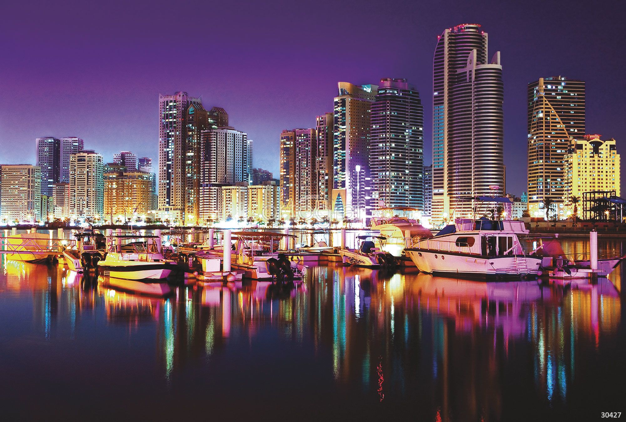 Изображение показывает современный городской порт с причаленными яхтами на переднем плане и высотными зданиями на заднем плане. Архитектура подчеркивает динамику и масштаб большого мегаполиса у воды, а ночная подсветка и отражения в воде создают атмосферу роскоши и городской жизни.