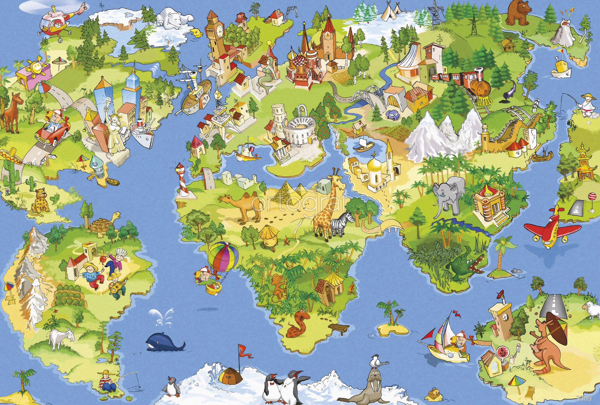 Занимательная иллюстрированная карта мира с известными зданиями, животными, транспортом и природными объектами погружает в атмосферу путешествий и открытий. Такой сюжет отлично развивает воображение, кругозор и интерес к разнообразию нашей планеты.