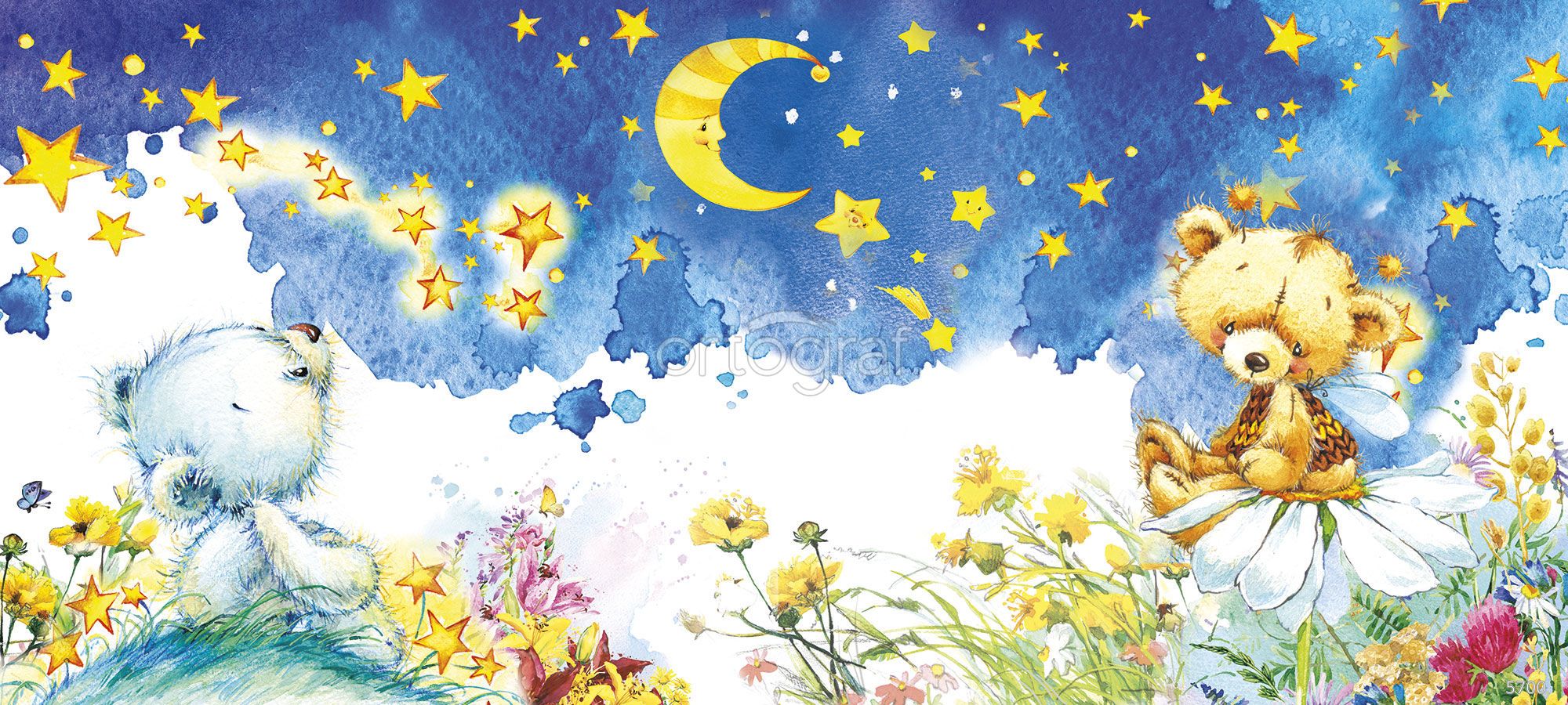 Сказочная иллюстрация с пушистым мишкой на ромашке, звёздным небом и улыбающейся луной, рядом сидит белый медвежонок среди полевых цветов. Атмосфера мечтательности, уюта и сказочного спокойствия отлично подходит для оформления пространства, создающего ощущение защищённости и нежности.