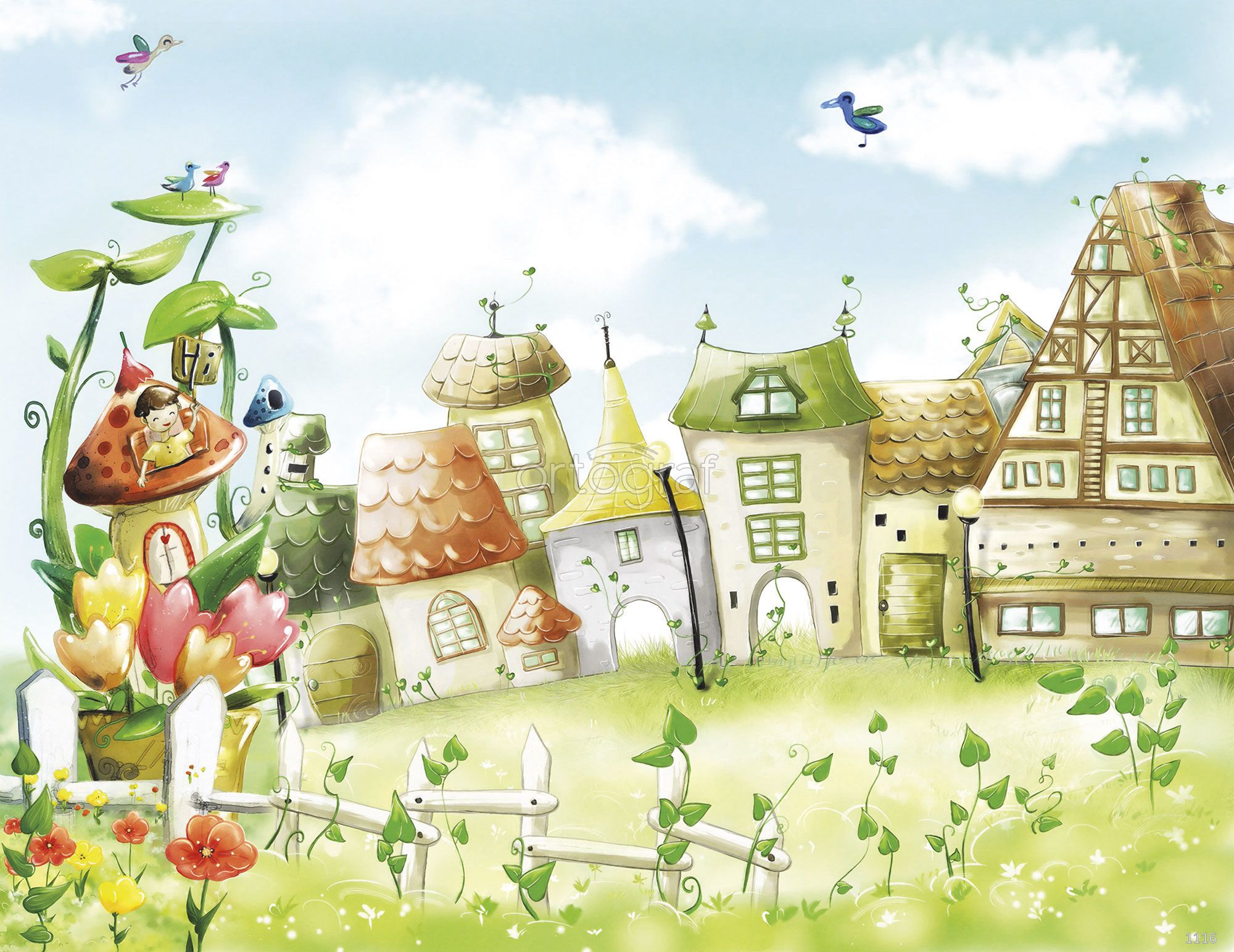 Изображена оживлённая сказочная деревня с необычными домами, каждый из которых отличается своей причудливой формой и деталями. Слева в домике-грибке сидит ребёнок, а вокруг растут огромные цветы и вьются растения. В небе и на вершинах растений порхают сказочные птицы, добавляя композиции атмосферу волшебства и беззаботности.