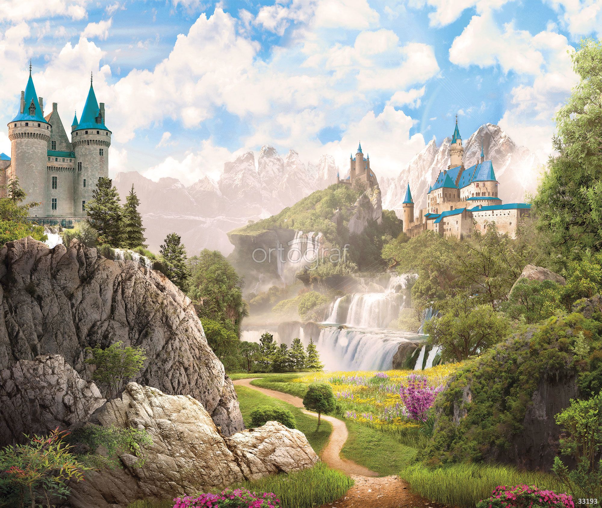 В этом волшебном пейзаже изображены величественные замки, водопады и горы, что создаёт сказочную атмосферу и ощущение приключения. Картина отлично подойдёт для оформления помещений, где хочется создать атмосферу уюта и погружения в фантастический мир. Особенно хорошо этот рисунок будет смотреться в детской, гостиной или спальне.