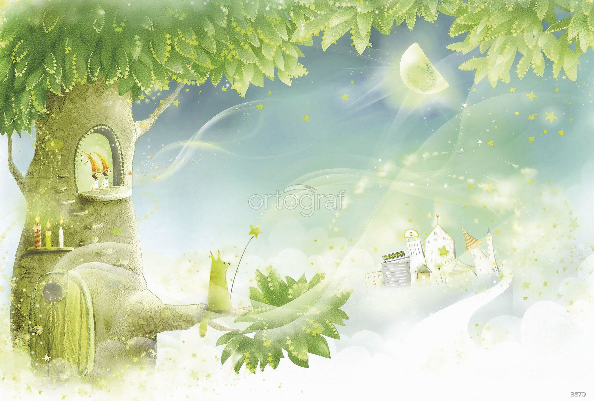 Сказочный рисунок с волшебным деревом, домиком в стволе, звездным небом и маленькими персонажами создает атмосферу мечты и уюта. Иллюстрация наполнена деталями, которые привлекают внимание детей и вдохновляют на воображение. Такой сюжет идеально подойдет для детской комнаты, создавая настроение сказки и фантазии.