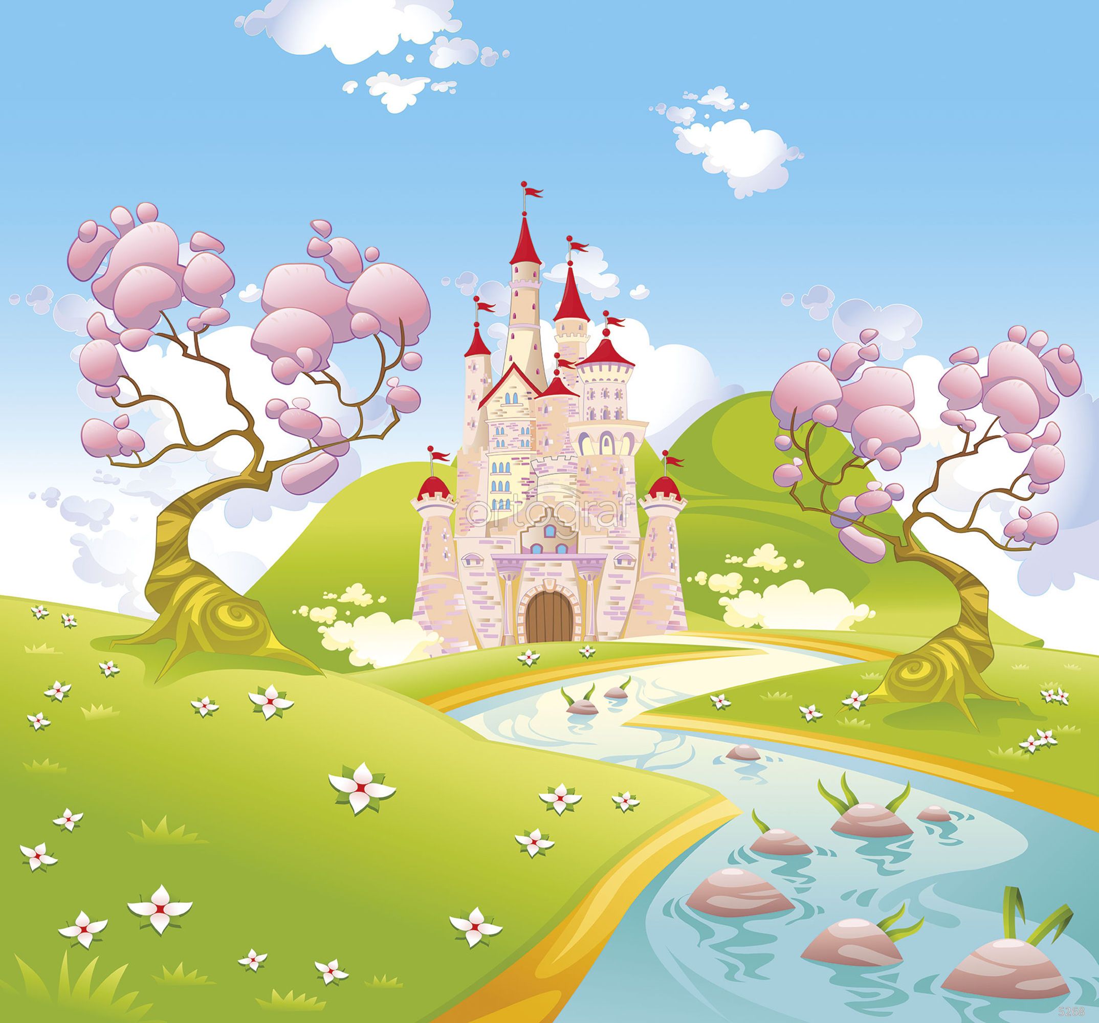 Иллюстрация волшебного замка на фоне холмов, цветущих деревьев и ручья создает атмосферу сказочного мира и фантазии. Такой сюжет прекрасно подойдёт для оформления пространства, где важна позитивная, игривая и вдохновляющая атмосфера. Особенно гармонично впишется в детской комнате.