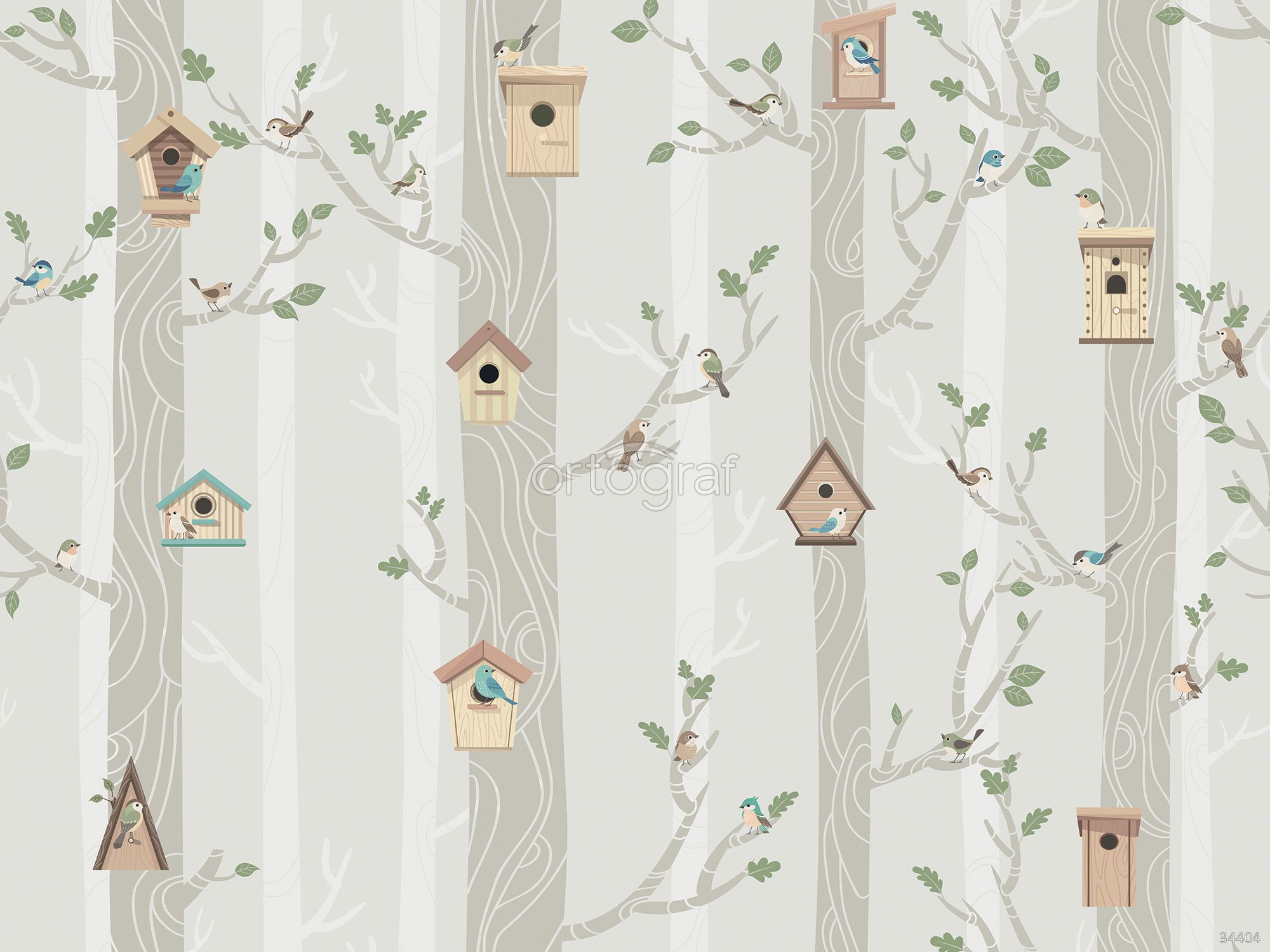 На изображении показаны стилизованные деревья с ветвями, на которых расположены разнообразные скворечники и сидят птицы. Иллюстрация создаёт атмосферу уюта, свежести и природной гармонии, отлично подходит для тех помещений, где хотят добавить лёгкую природную тематику и ощущение комфорта. Такой сюжет универсален для современных интерьеров.
