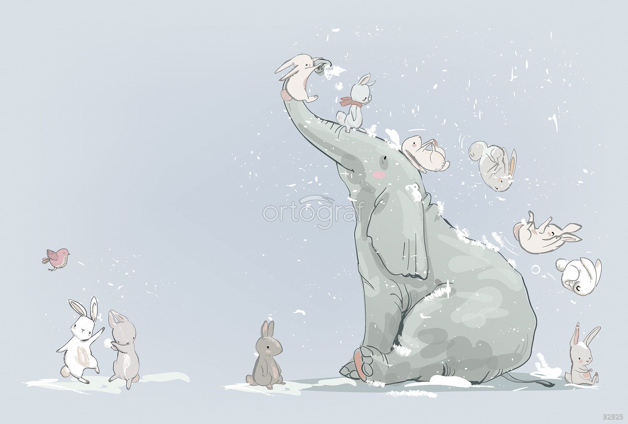 На изображении изображён сидящий слон, вокруг которого резвятся кролики и летает маленькая птица. Иллюстрация создаёт атмосферу уюта, дружбы и беззаботной игры, отлично подходящую для оформления пространства, где важна теплая и жизнерадостная атмосфера. Такой сюжет будет особенно актуален для детских комнат и игровых зон.