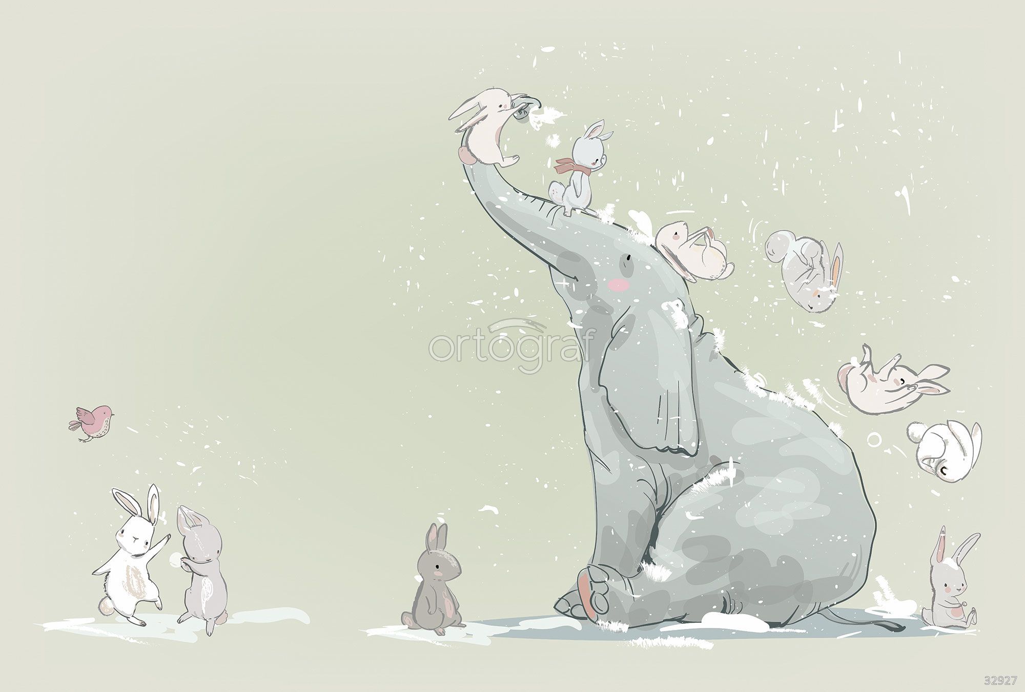 На изображении изображён сидящий слон, вокруг которого резвятся кролики и летает маленькая птица. Иллюстрация создаёт атмосферу уюта, дружбы и беззаботной игры, отлично подходящую для оформления пространства, где важна теплая и жизнерадостная атмосфера. Такой сюжет будет особенно актуален для детских комнат и игровых зон.