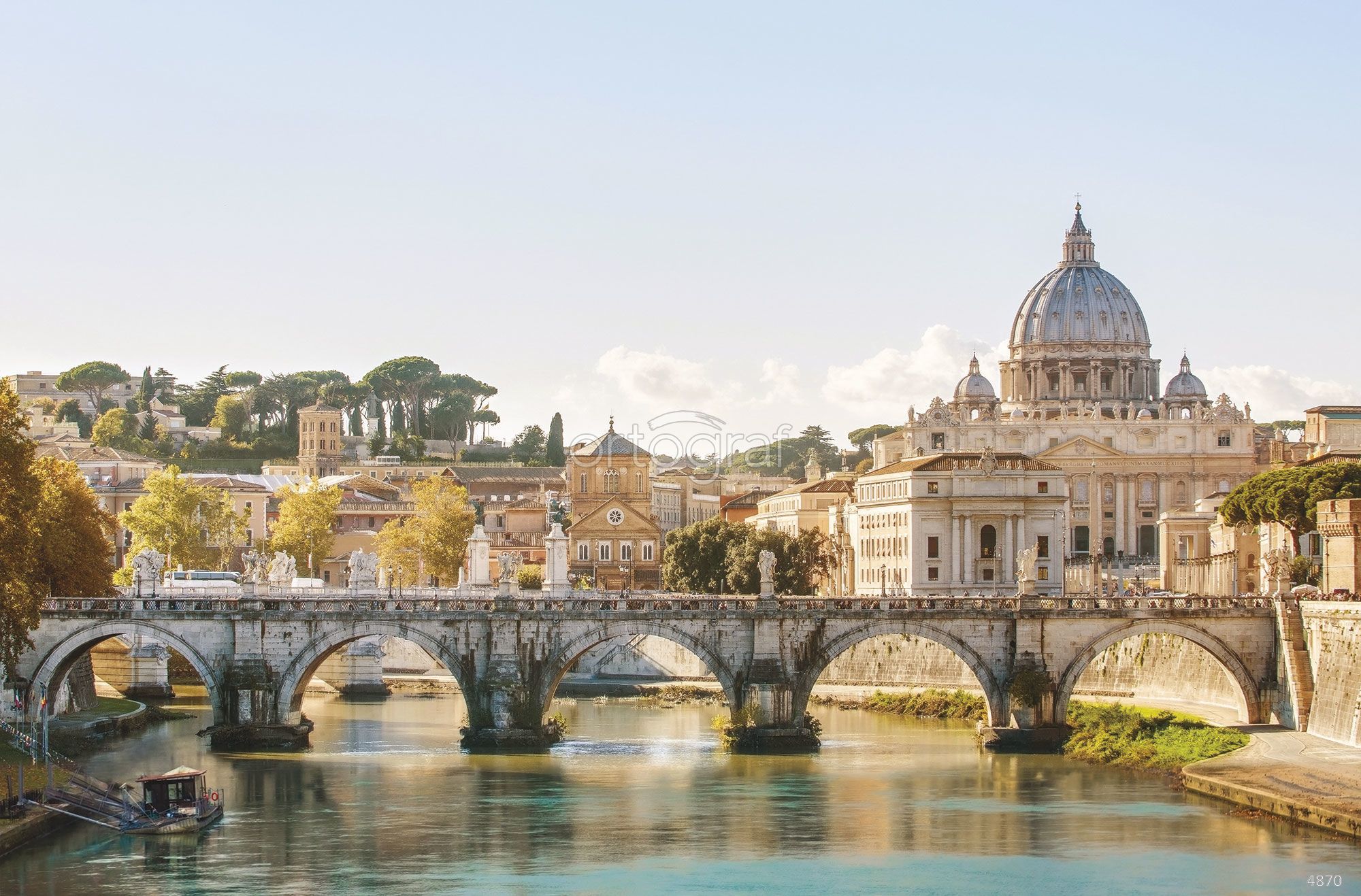 Городской пейзаж с видом на купол Собора Святого Петра и мост через реку отображает знаменитую достопримечательность Рима — Ватикан и собор Сан-Пьетро. Сюжет ассоциируется с историей, культурой и великолепием вечного города, отлично подходит для создания атмосферы вдохновения и эстетики в интерьере. Такая композиция уместна в гостиных, офисах или столовых с классическим или европейским акцентом.