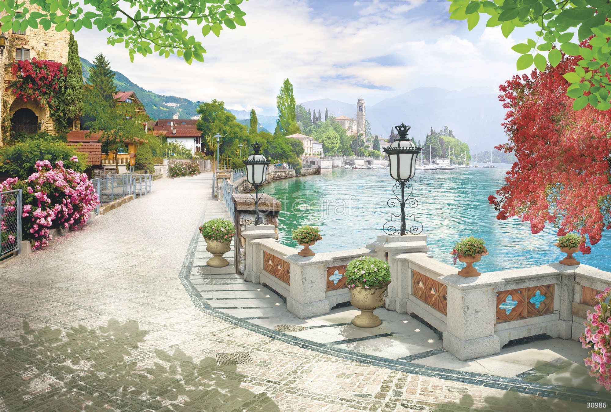 На изображении уютная набережная с видом на озеро, старинными фонарями, цветущими кустами и домами, окружающими воду и зеленые холмы на фоне. Композиция передает атмосферу спокойствия, гармонии и европейского уюта, располагает к отдыху и мечтательности. Такой сюжет отлично подойдет для оформления пространств, где важна атмосфера расслабления и природной красоты.
